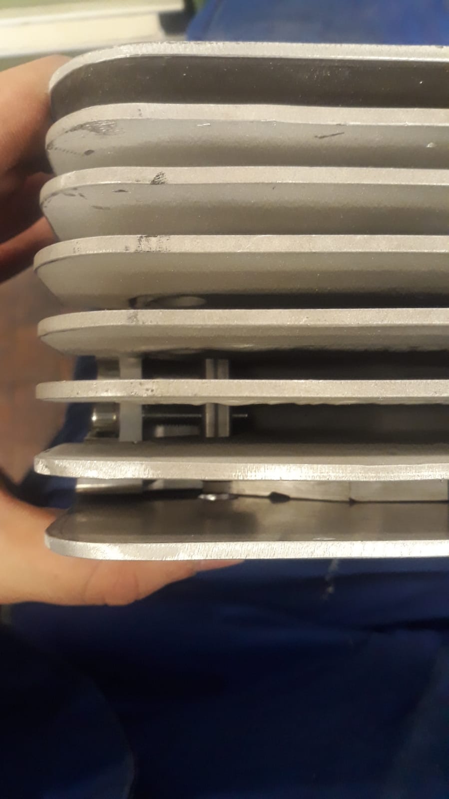 Zuerst habe ich das Krümmergewinde instandsetzen lassen, dann bekam der Zylinder wieder Anschweißrippen, doch damit nicht genug. Ich habe ca. 80 AlMg5 Schweißstäbe in den Zylinder geschoben damit er insgesamt länger wird. Den Membrankastenausschnitt habe ich händisch eingebracht um auch hier aufzuschweißen. Denn bei 60mm Buchse bleiben hier nur 3mm Material an der dünnsten Stelle stehen. Wenn mans einmal macht, dann mal anders wie davor ![]()