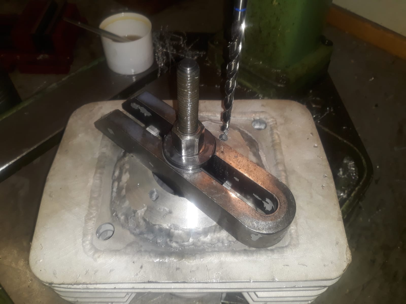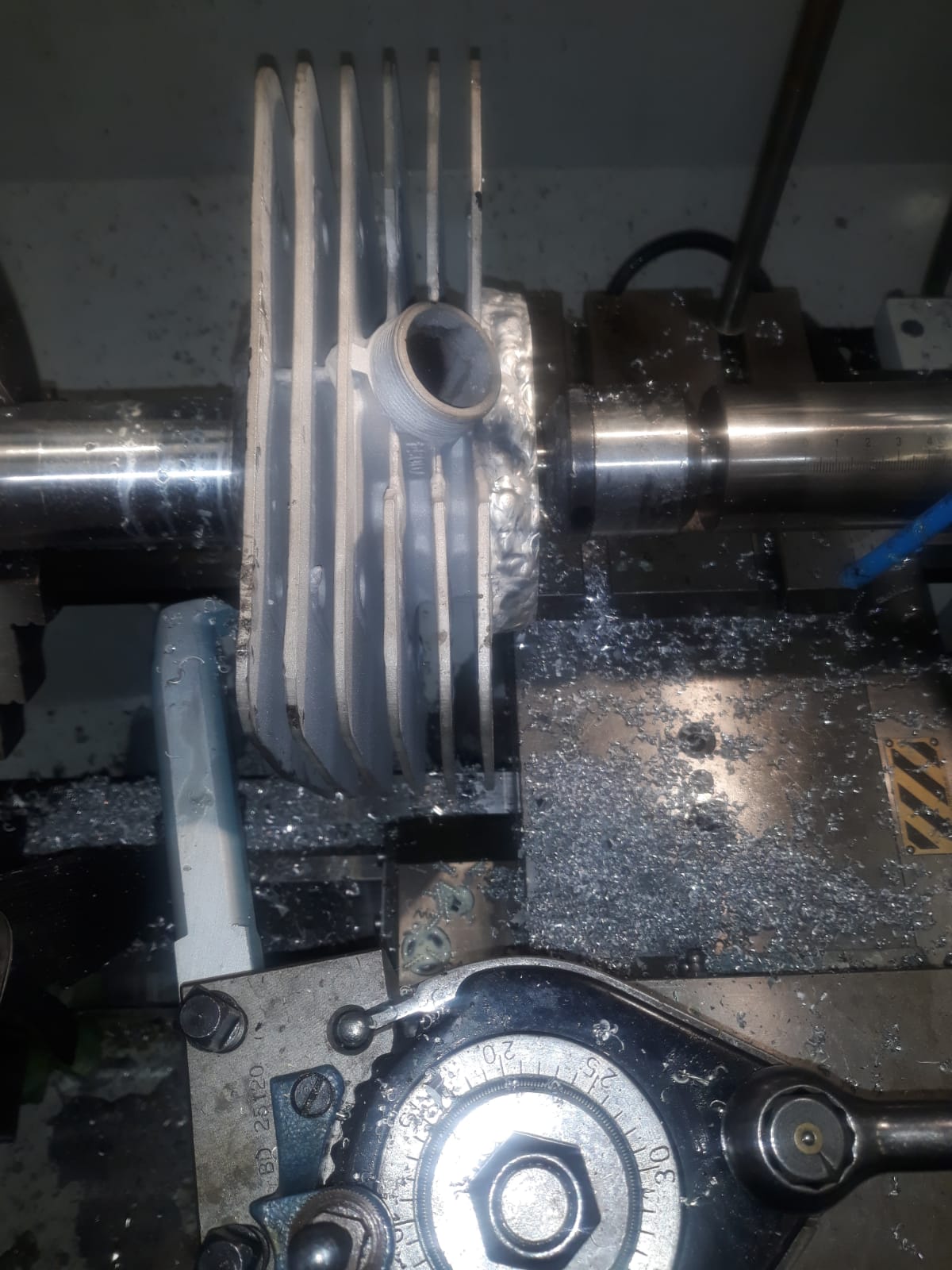 Zuerst habe ich das Krümmergewinde instandsetzen lassen, dann bekam der Zylinder wieder Anschweißrippen, doch damit nicht genug. Ich habe ca. 80 AlMg5 Schweißstäbe in den Zylinder geschoben damit er insgesamt länger wird. Den Membrankastenausschnitt habe ich händisch eingebracht um auch hier aufzuschweißen. Denn bei 60mm Buchse bleiben hier nur 3mm Material an der dünnsten Stelle stehen. Wenn mans einmal macht, dann mal anders wie davor ![]()