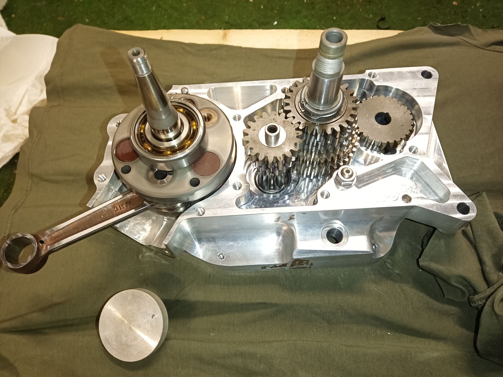 Ein sehr wichtiges, noch fehlendes Motorenteil ist nun in meinem Besitz. Die Ronge Motorsport Kurbelwelle mit 54mm Hub und 105mm Pleuel. Ich habe die Welle in Einzelteilen bekommen und von 2 Takt Motorentechnik List pressen und richten lassen. Das Ergebnis ist ein Rundlauf von unter 1/100 Milimeter, einfach Sahne.Die Welle ist eine richtige Motorradwelle finde ich. Ein unteres Pleuellager mit 15mm Breite ist verbaut, das untere Pleuelauge hat 14.5mm Breite, Anlaufscheiben sind nicht vorgesehen. Die Hubscheiben sind im Durchmesser 4mm größer wie Original, also 88mm. Das bedeutet mein CNC Gehäuse muss noch ausgespindelt werden, was ich aber schon vermutete.