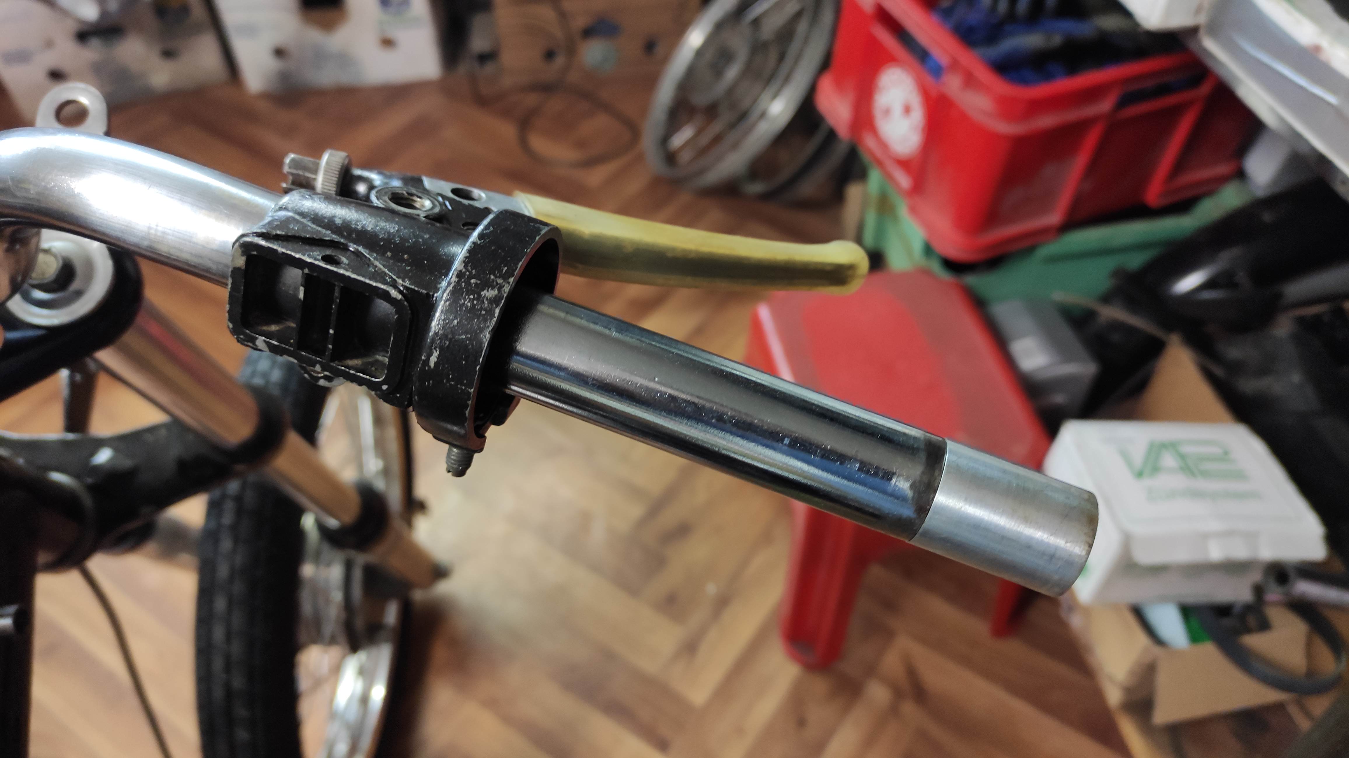 Ein Freund hat mir dezente Verbreiterungen für den Lenker gedreht. Die originale Breite sagt mir leider nicht zu, da bekomme ich bereits nach 30min Fahrt Rückenprobleme. Und auf diese Art konnte ich den patinierten Lenker weiterverwenden, die Verbreiterung ist unauffällig.