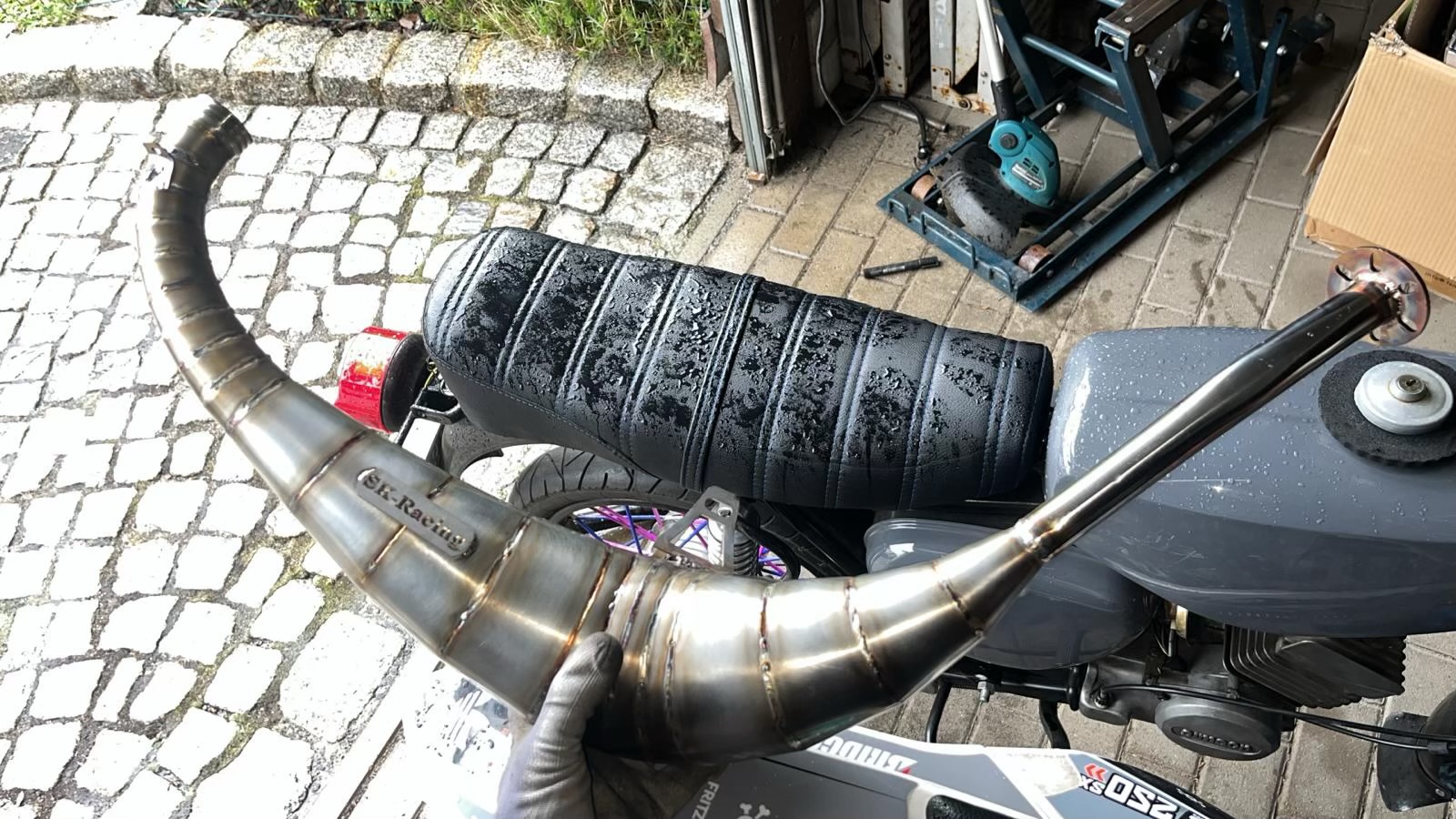 Guten Morgen Gemeinde, das sind meine neusten Versuche für eine Verlegung unterm Moped. Der Aupuff hat vielleicht 680?mm Länge und ist 110mm dick. Ich hab auch ne lange und ne kurze Variante für den MTX. Die kurze fürnMTX ist ne stark vereinfachte „Kopie“ des RSA 125. Die Lange hat dann in etwa LTM85 Längen aber mit fetten Durchmessern.