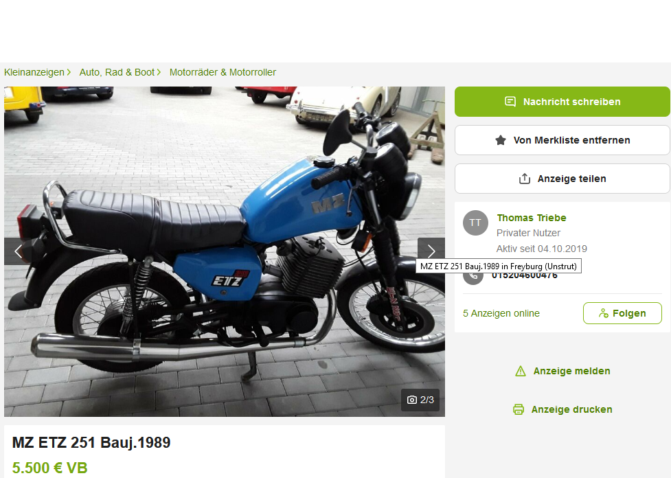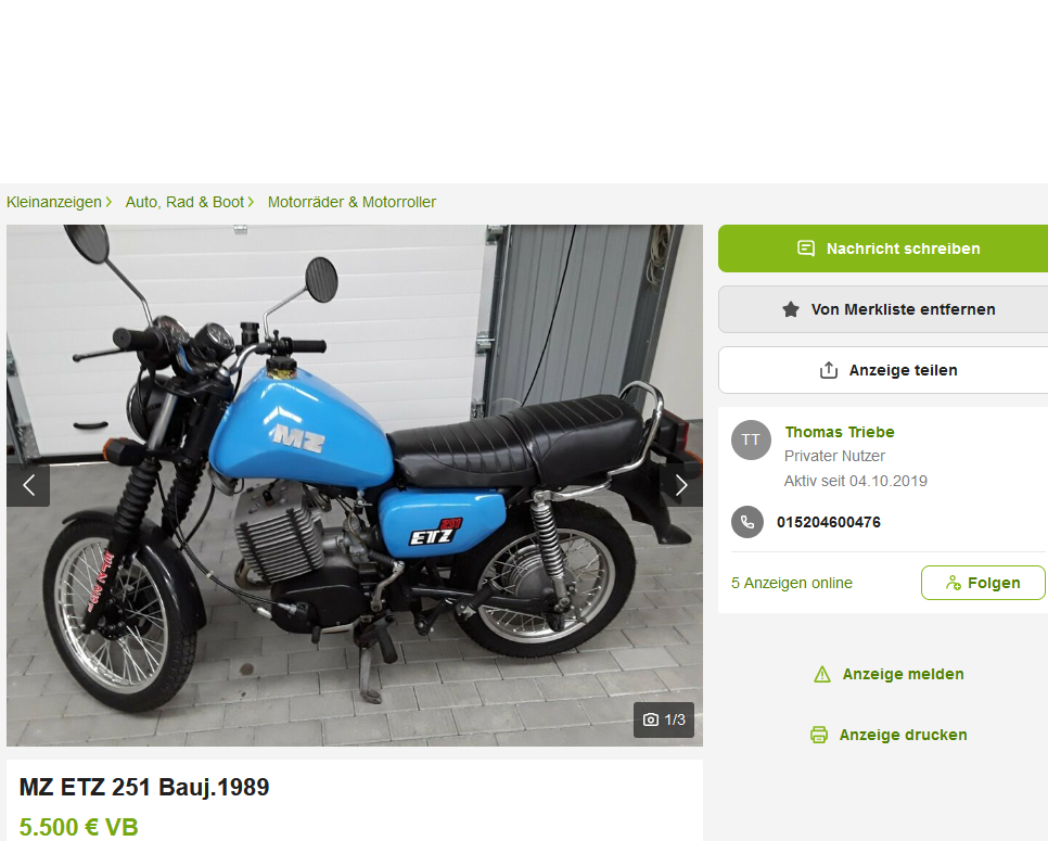 mal ne simple Frage an die Kenner des MZ Marktes...ist sowas für den Preis noch realistisch oder schon Wucher? ja es gibt nicht viele 251er auf dem Markt - aber wie "teuer" sollte ein gutes Exemplar im Schnitt sein? gibt es Teile/Baugruppen die wenn sie verbaut sind zb. als Orginalteil einen so hohen Wert haben das man sagen kann -ja der Preis ist zb. gegenüber einer anderen die das nicht hat gerechtfertigt?