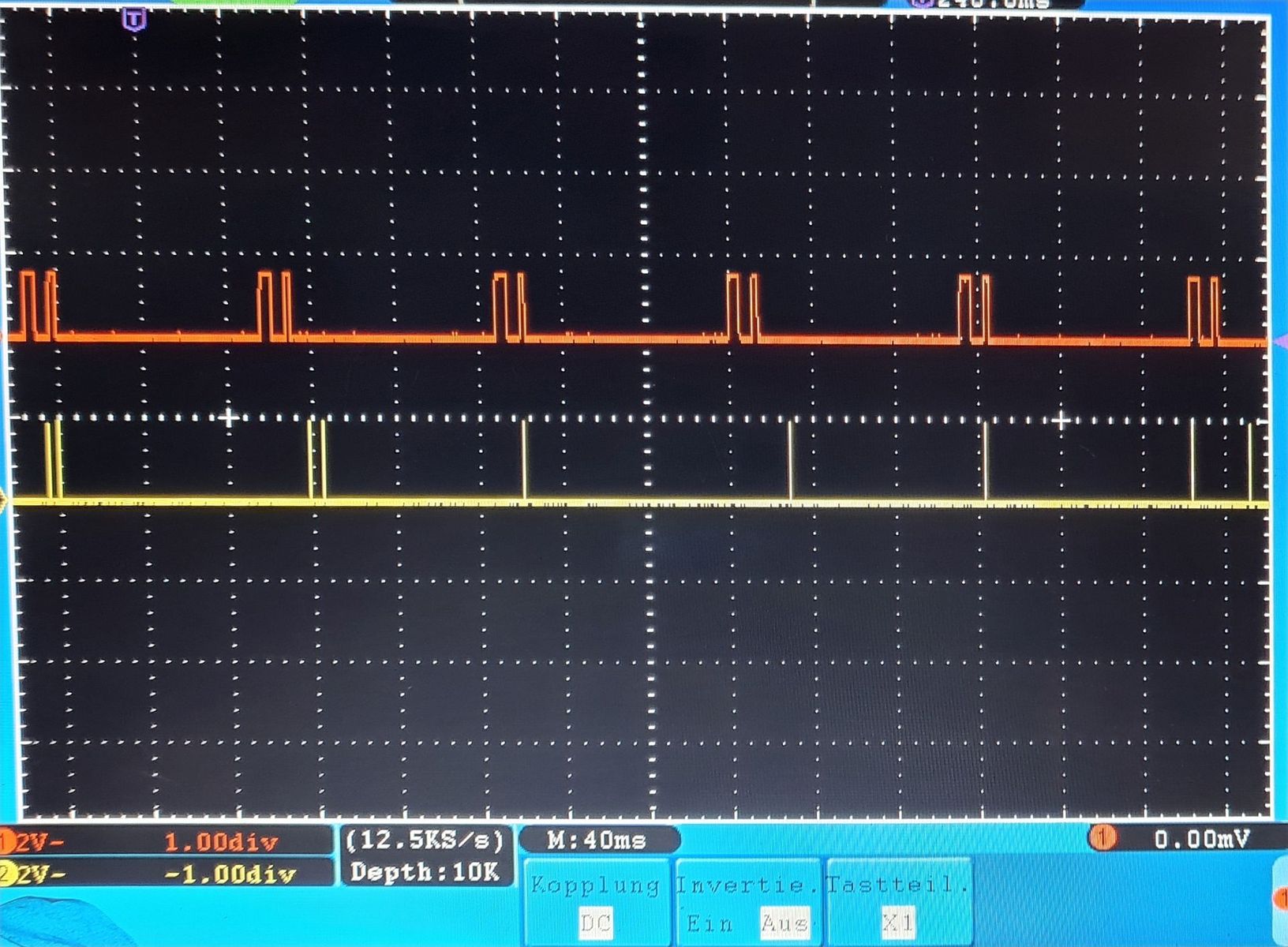 Wenn die Drehzahlangabe sauber steht, ist das ein gutes Indiz für sauber funktionierenden Code.Die schlechte Nachricht: Ich habe mittlerweile den Code stark erweitert, aber nicht getestet. Das rächt sich gerade, das Signal zum Zünden (gelb) läuft nicht mehr synchron zum Eingangssignal/Pickupsignal der Vape (rot) und erfolgt manchmal doppelt. Da bin ich selbst Schuld, weil die Routine des Softwaretests vernachlässigt wurde.
