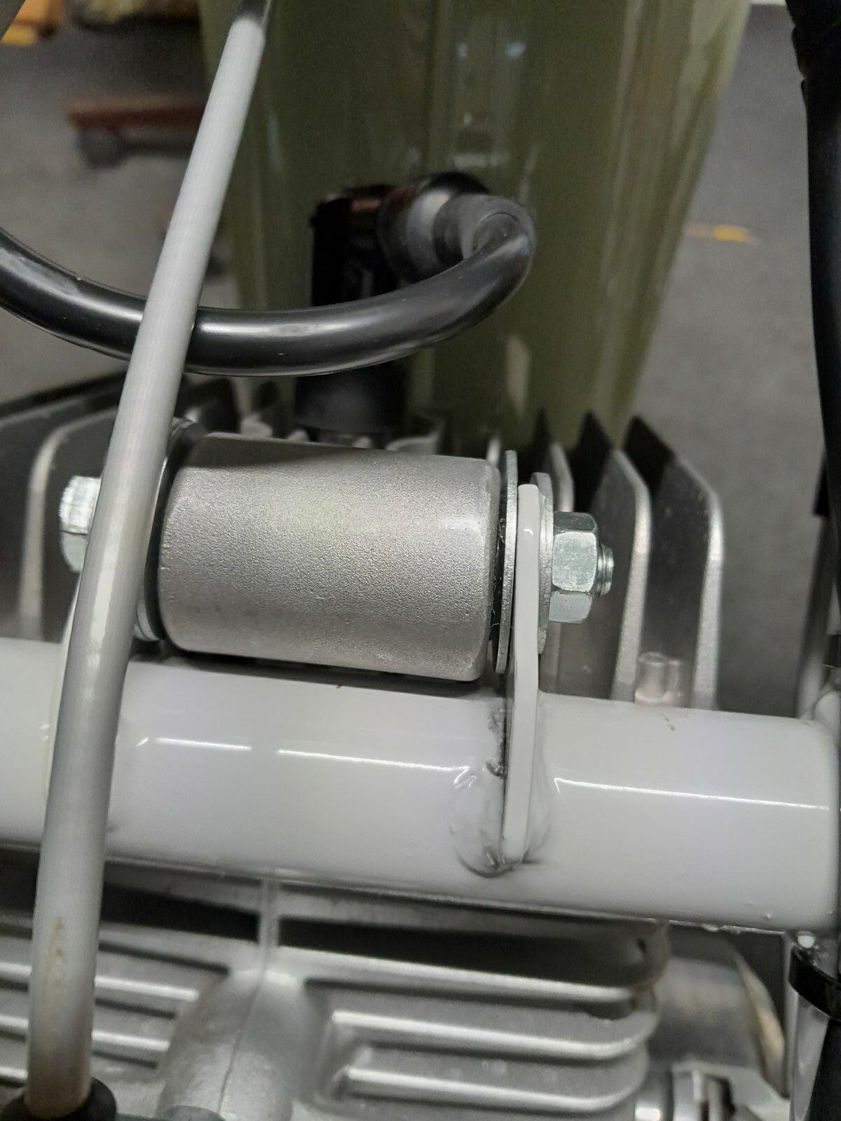 Also habe ich dort einfach den 8 mm Bolzen direkt durchgeschoben. Links und rechts jeweils eine große Anschlagscheibe, damit der Gummi immer auf Position bleibt. Festgeschraubt. Fertig.