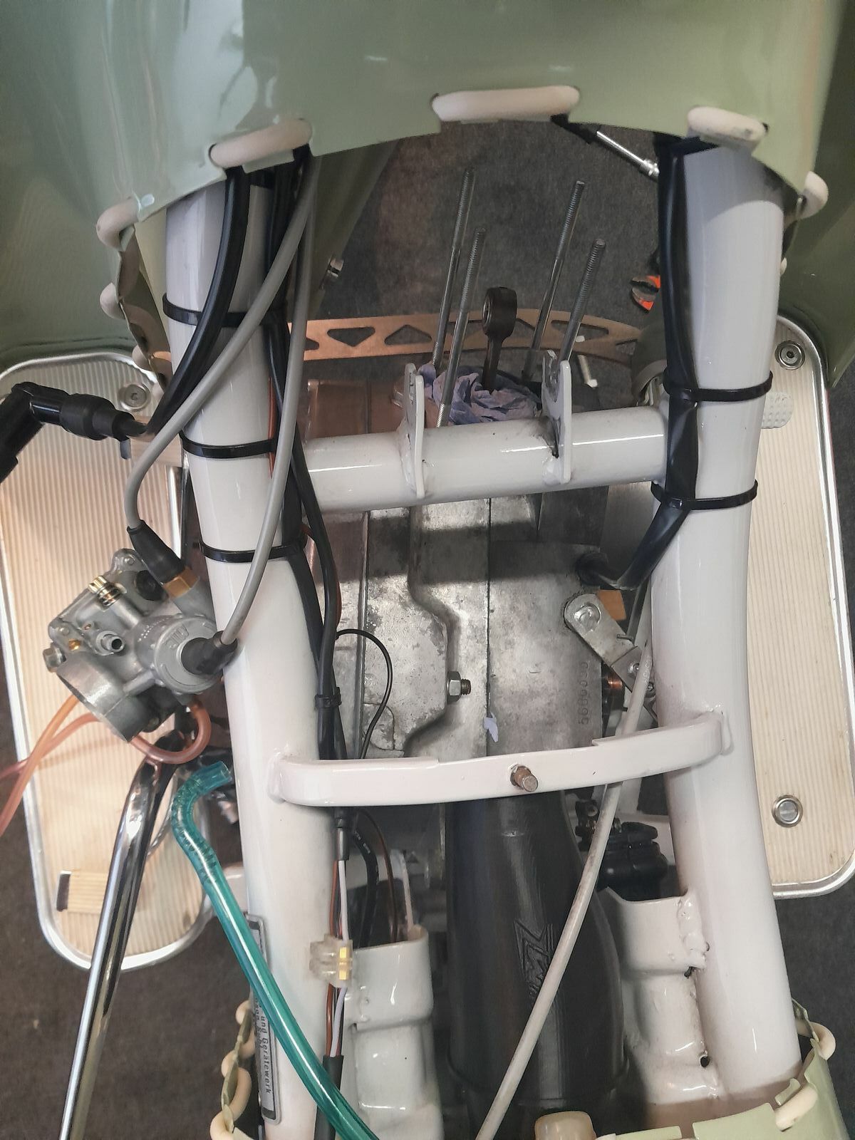 Es ging leichter als gedacht. Nachdem ich die beiden Motorbolzen demontiert hatte, ließ sich der Motor problemlos nach vorne schieben. So ließ sich der Zylinder ohne viel Aufwand wechseln.
