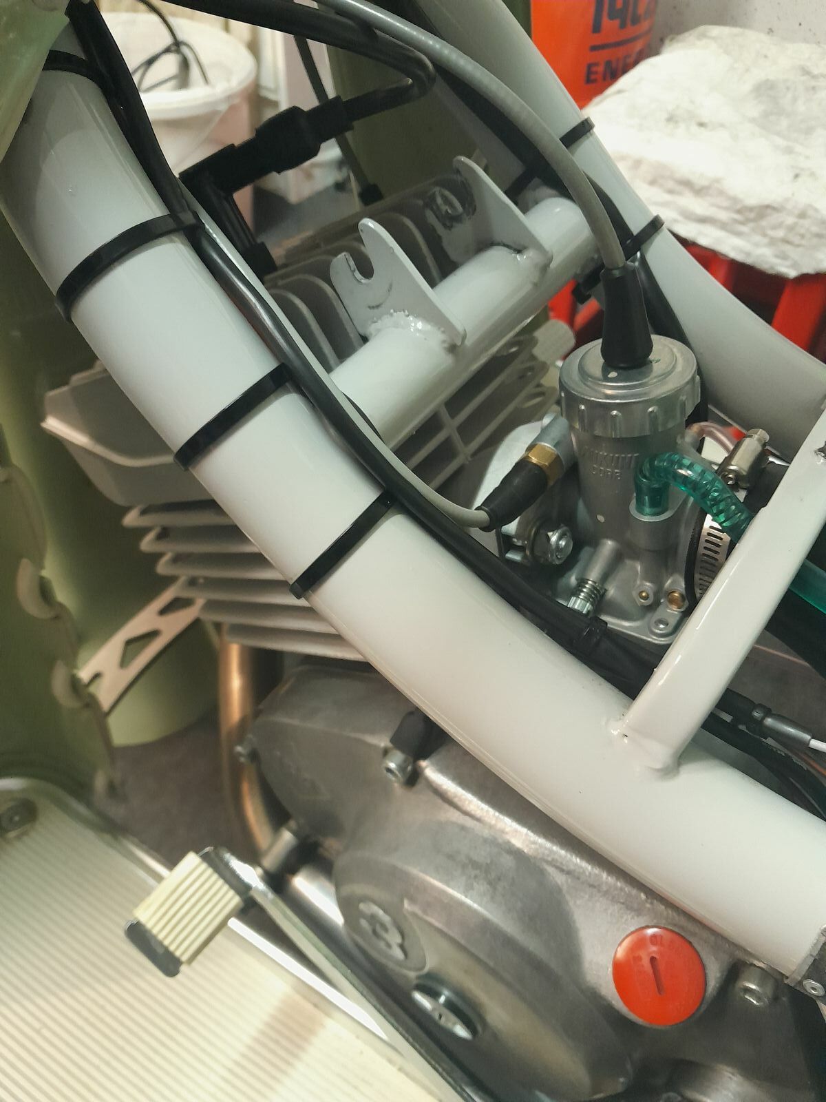 Die Lage des Tanks und die Fallhöhe des Benzinschlauchs entsprachen exakt dem Aufbau in der Schwalbe. Lediglich der Knickschutz und der Vergaserstutzen waren nicht verbaut. Das tut dem, soviel kann ich schon einmal verraten, sensationellen Ergebnis nichts zur Sache.