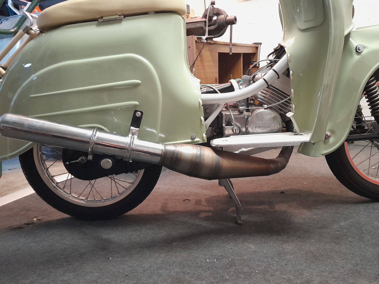 ZT liefert den Auspuff mit 18 mm Röhrchen in der Endtüte aus. Da mein System durchaus Richtung 20 PS tendiert, war mir der Durchmesser für den Straßenbetrieb einen Tick zu klein. In der Spitztüte werkelt nun ein 19 mm Röhrchen.