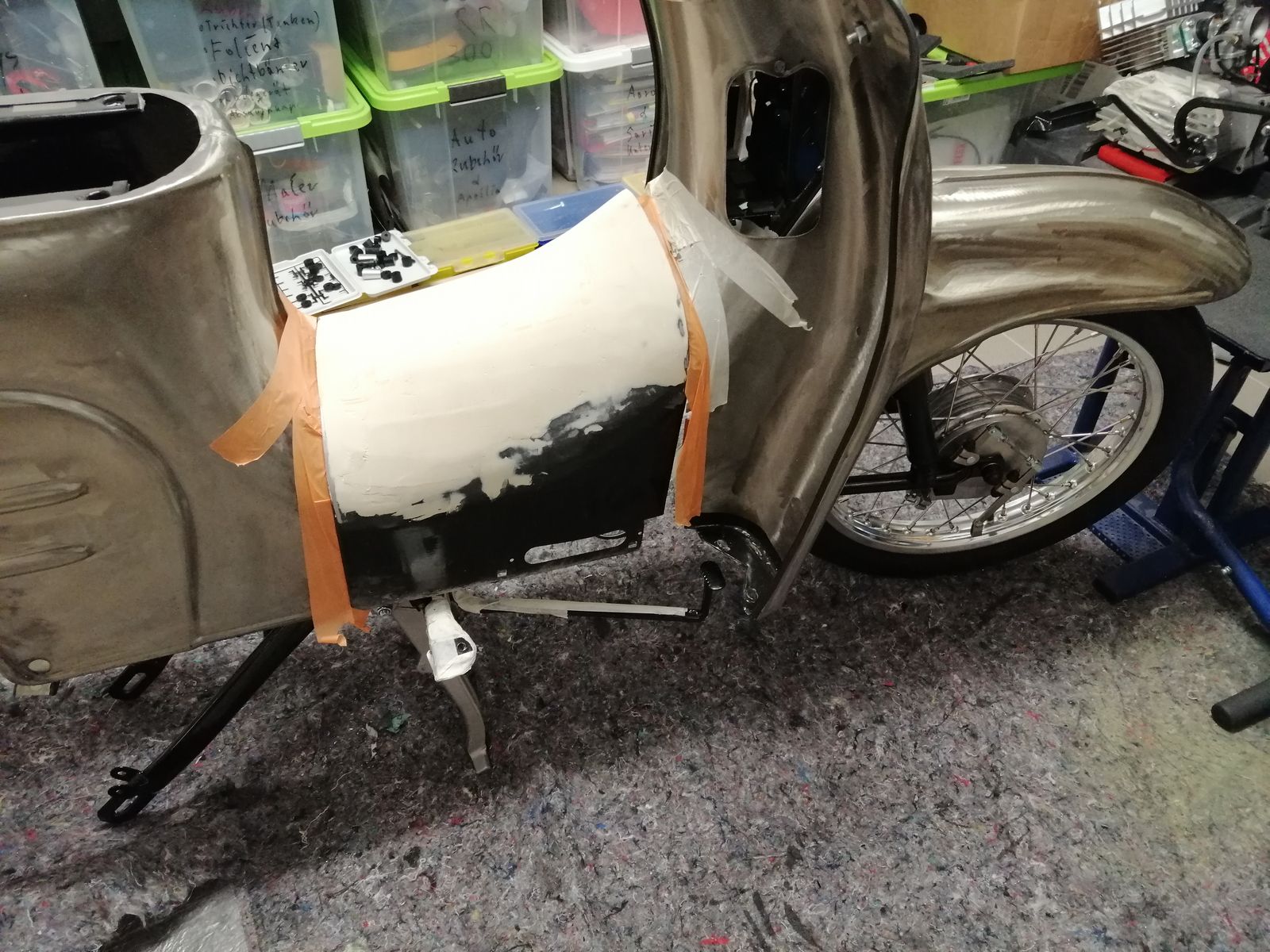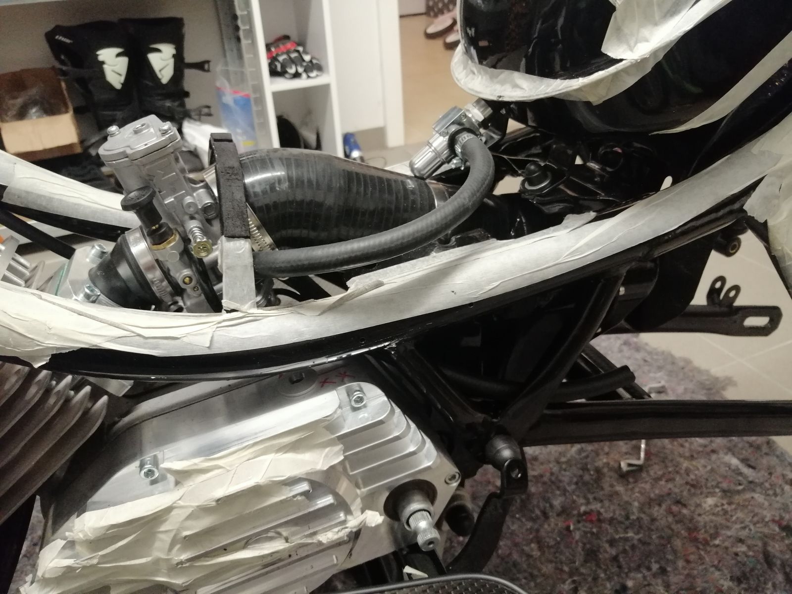 So, ging wieder mal weiter und der Ansaugkasten wurde noch final angepasst. Hat nur ewig gedauert und Schweins Arbeit, da mit Verbindungsstücken gearbeitet werden musste und Anpassungen vom Tank und der Halterung, um den 70er Ansaugschlach unterzubringen und führen zu können.