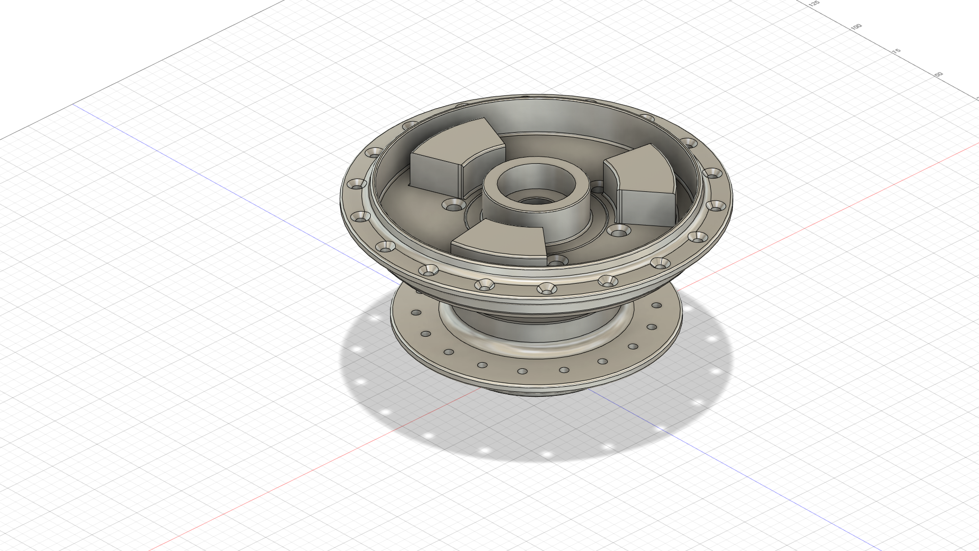 Und zwar möchte ich eine Scheibenbremsnabe für das Hinterrad drehen und fräsen, dafür habe ich mal ein CAD-Modell erstellt. Ich habe mich von der Ronge Nabe inspirieren lassen, aber die Maße sind natürlich anders.