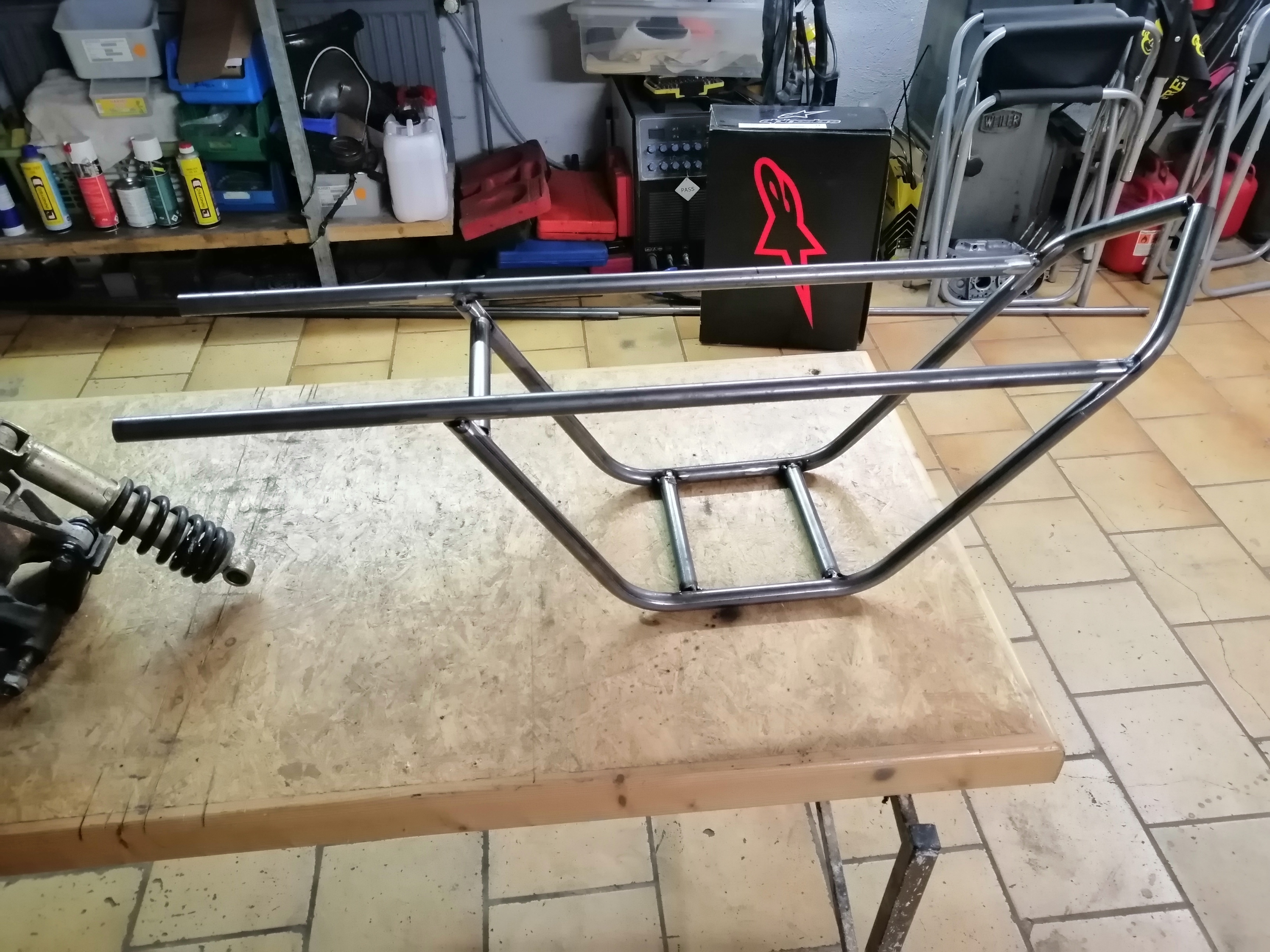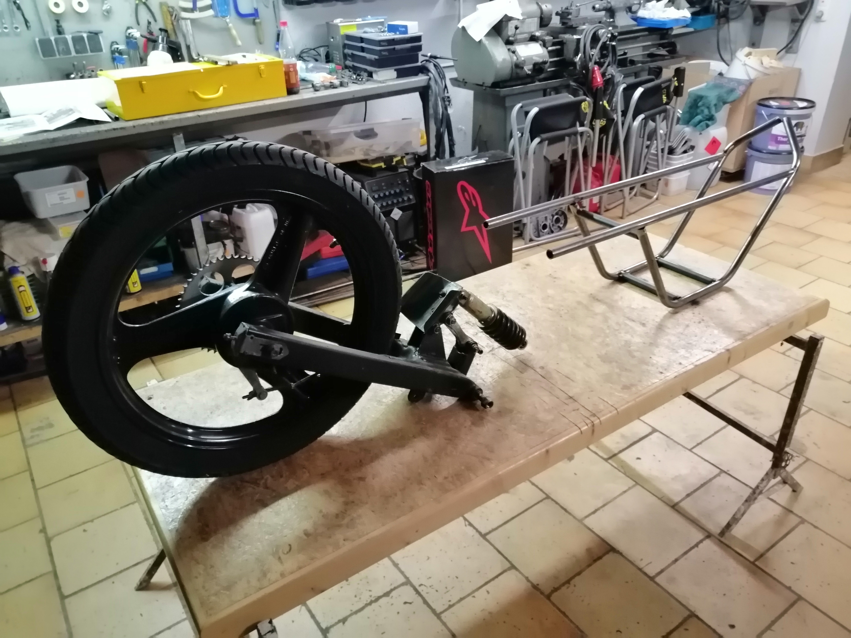 Das Fahrwerk steht soweit, im laufe dieser Woche werde ich mit dem Rahmen anfangen. Die Gabel und Schwinge inkl. Felgen stammen von einer Honda NSR 50, die Felgen sind den Originalen sehr ähnlich.