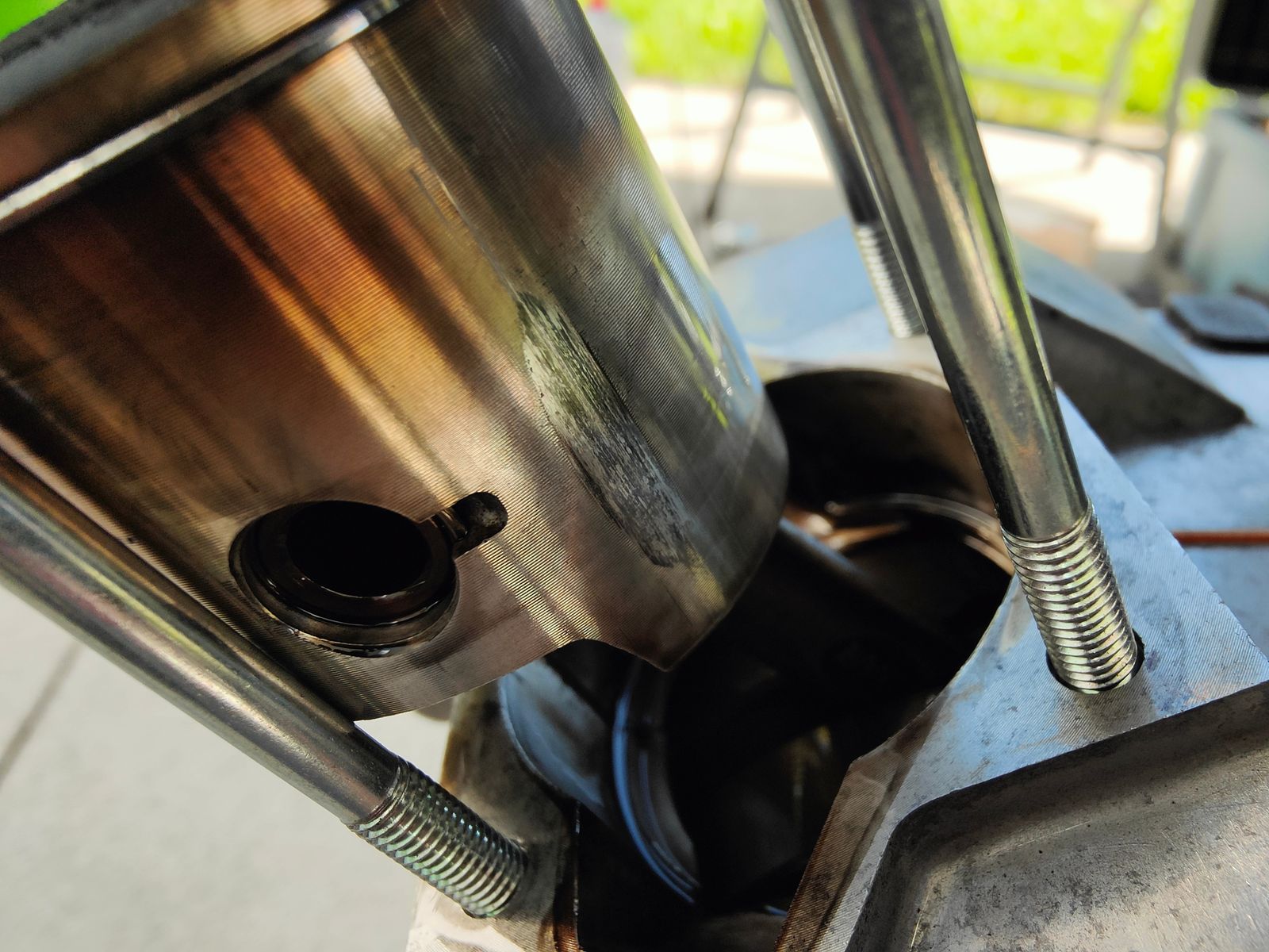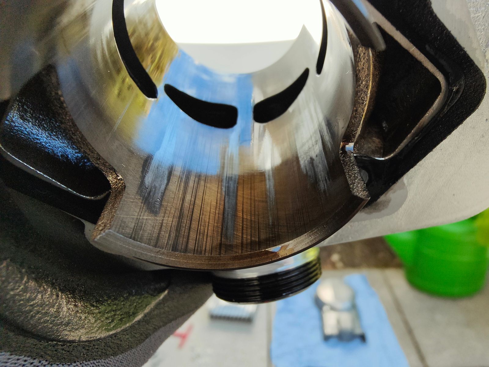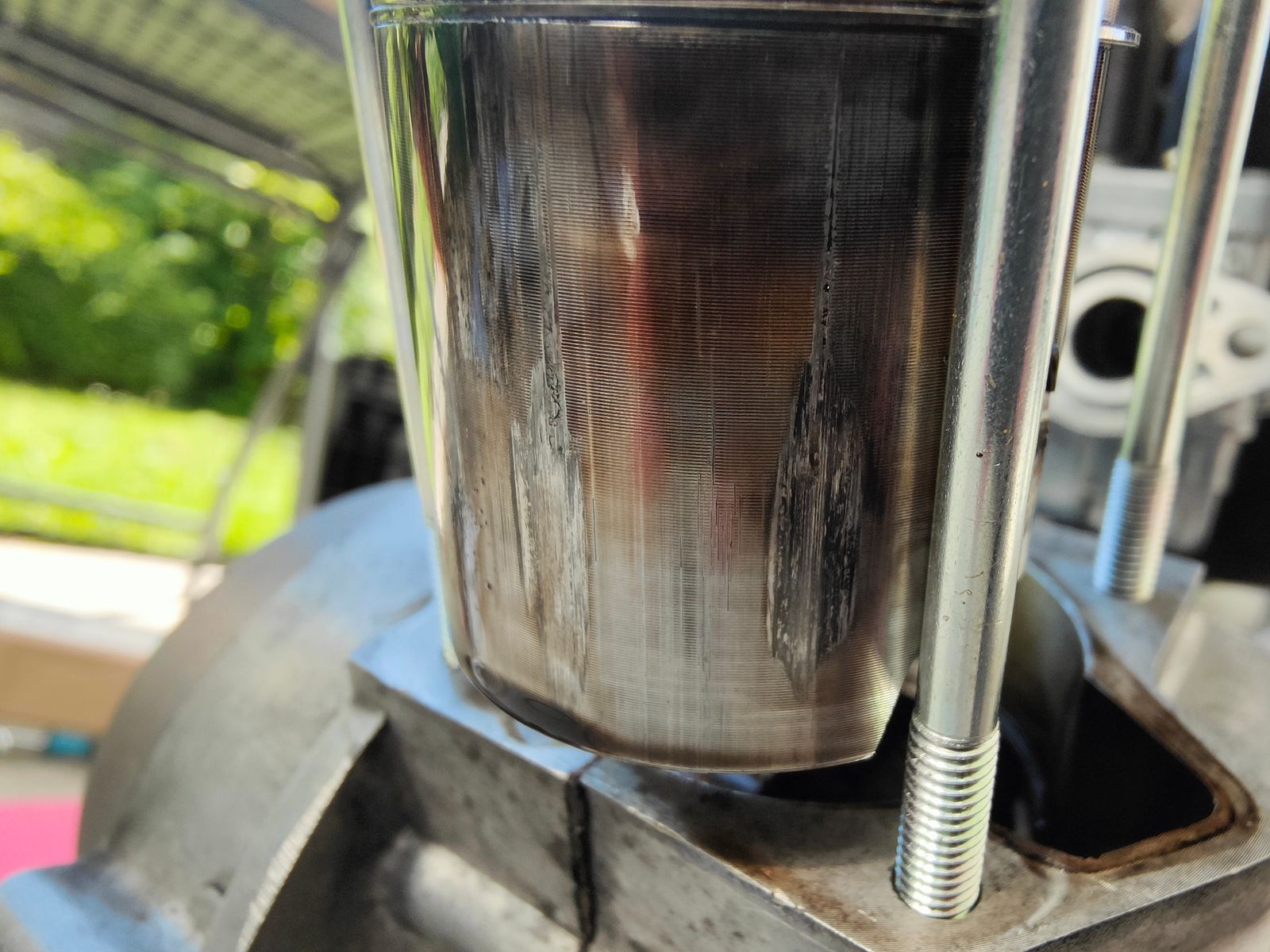 Durchlass Gegenkonus kann ich nicht sagen, es ist der MZA-Nachbauauspuff für die S51 unverändert. Schalldämpfereinsatz einfach von SaMo mit den 16mm Röhrchen und das Endrohr ist geweitet. Ich habe gerade den Zylinder runter, Fotos kommen noch. Die Spuren sieht man in der Buchse, man fühlt aber nichts. Kolbenringe sehen ebenfalls gut aus, nur der Kolben ist m.M.n. durchgenudelt.
