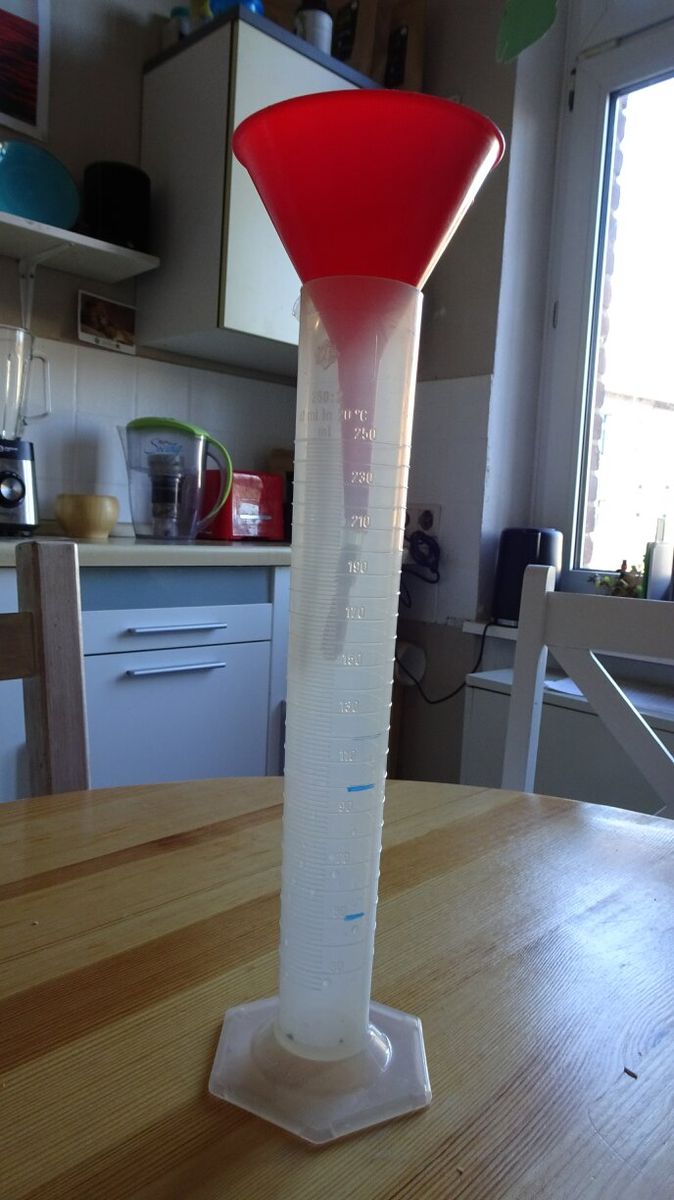 Ich habe über einen Trichter und Schlach Wasser durchlaufen lassen und gemessen wie lange es dauert bis 50 / 100 ml durchgeflossen sind.