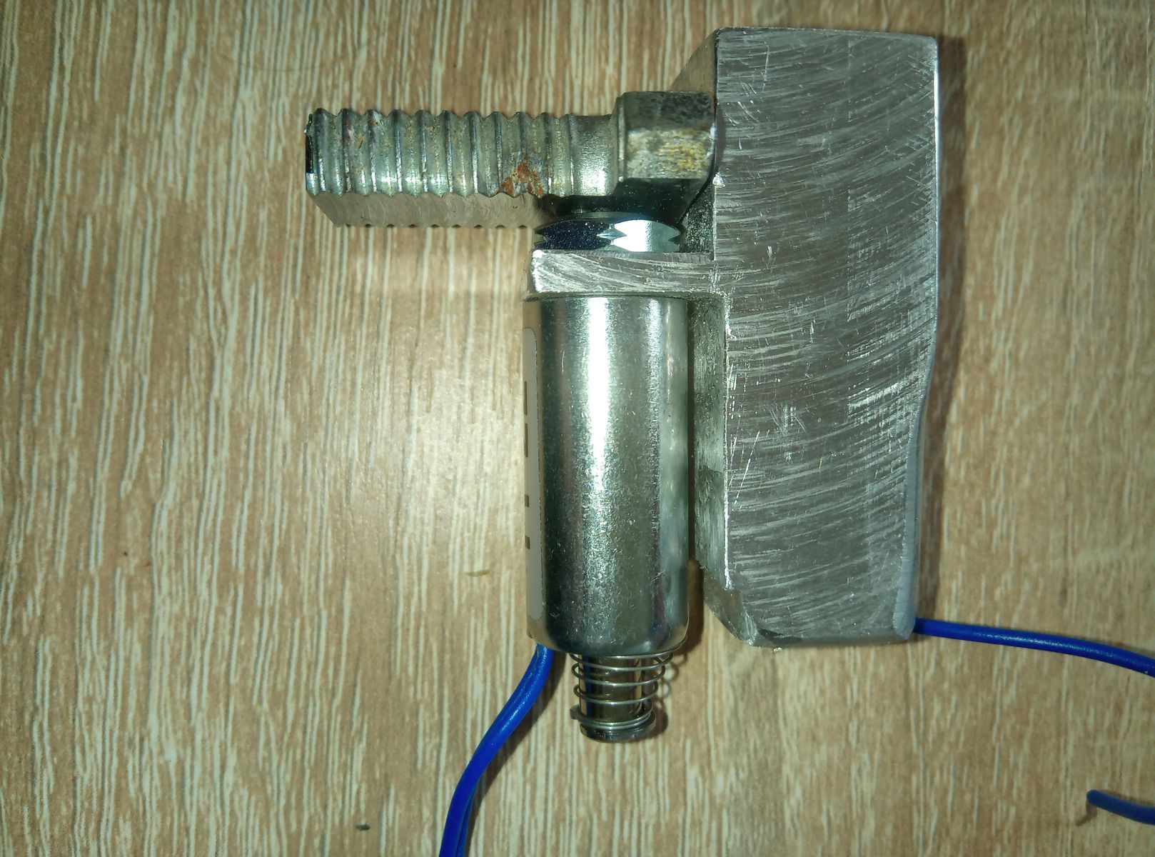 Mein Problem ist nun das ich den Mechanismus ( die flache Schraube) anders befestigen bzw. gestalten muss. Das sie noch die Kräfte aushält, und das der Magnet sie betätigen kann. Wenn ich den Mechanismus 90 Grad nach links drehe ( Schraube zeigt nach oben) reicht die Kraft schon aus.