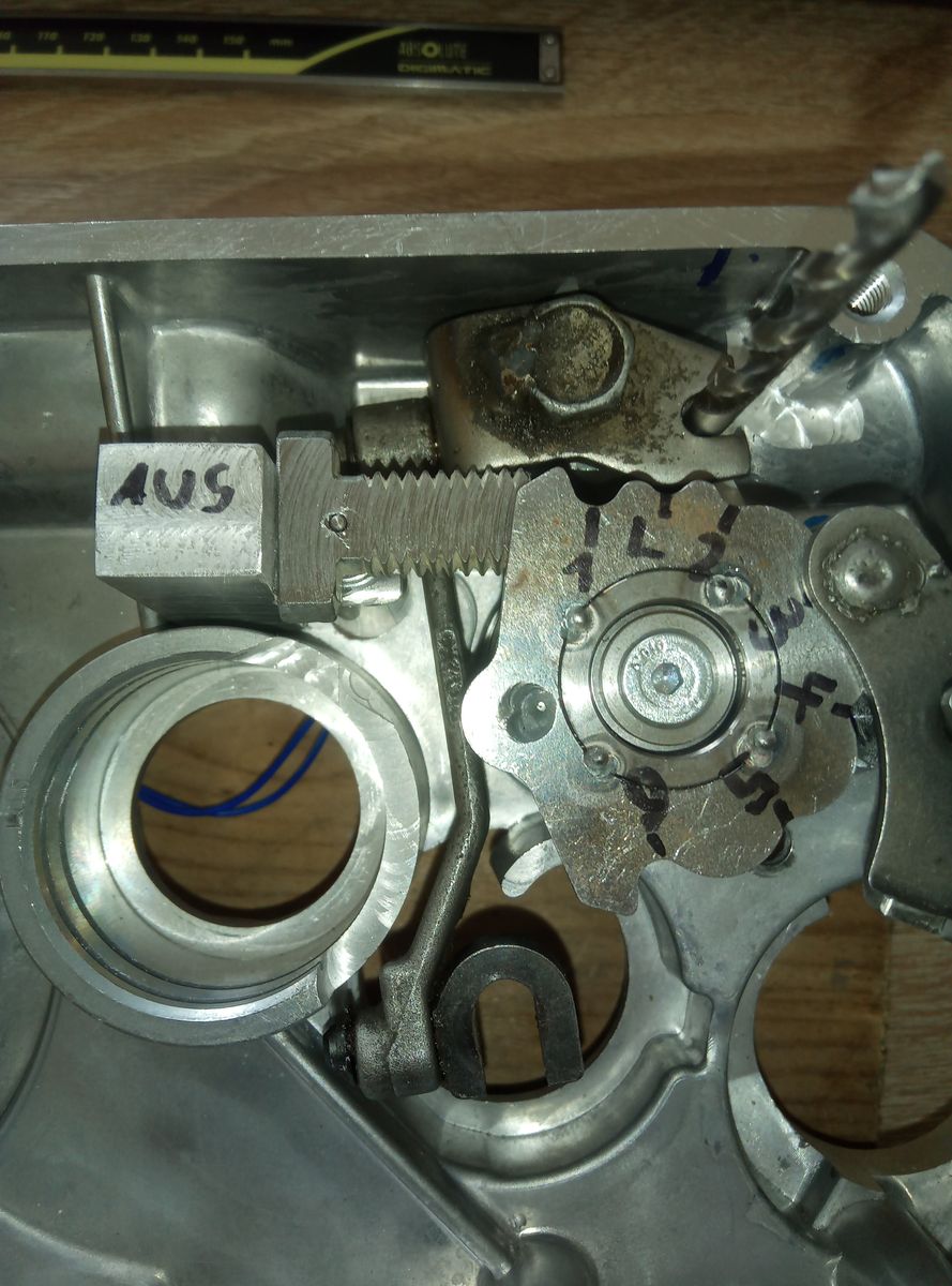 - die Schraube ist das Schubstück ( jetzt noch zu lang) das im eingelegten 3. Gang, gegen die Kurvenscheibe drückt