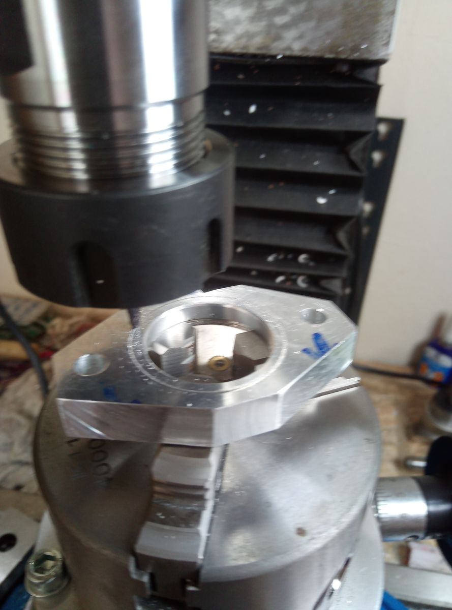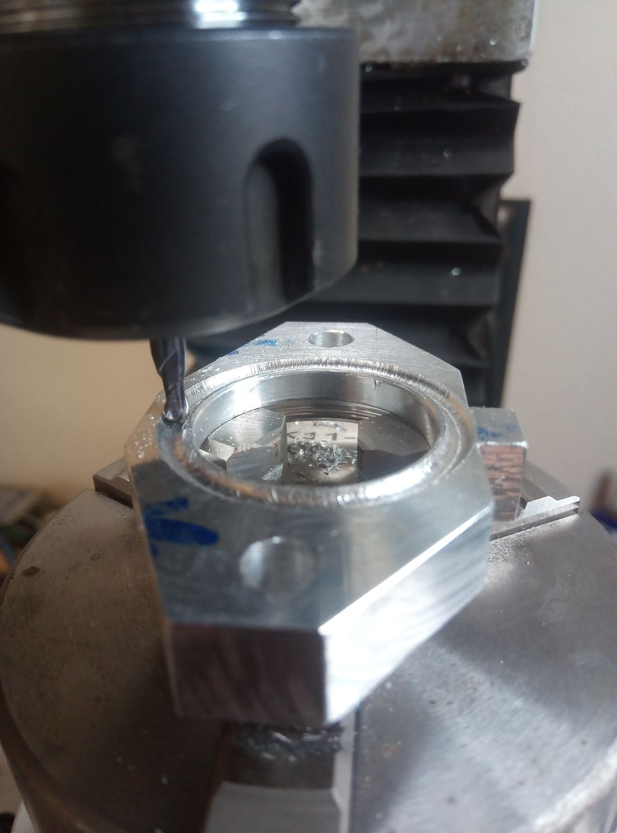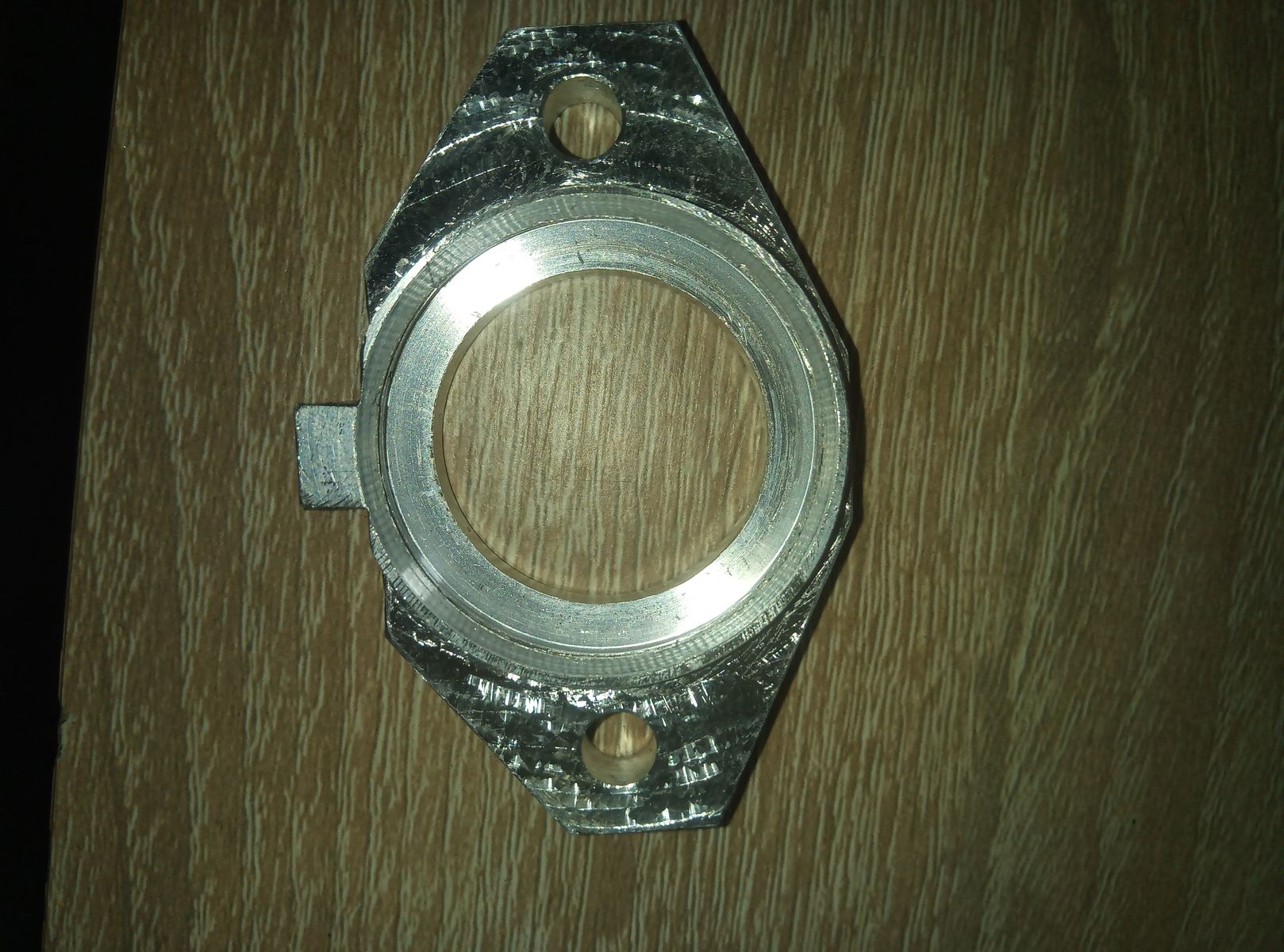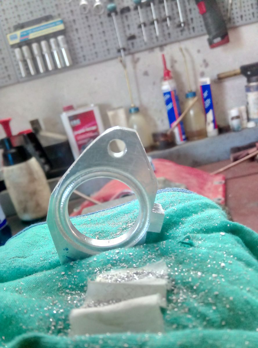 Der Vergaserflansch passt jetzt von der Position her einwandfrei. Der Vergaser muss zwar noch optisch überarbeitet werden, lässt sich aber schon sehr gut von den Stehbolzen ziehen ohne das er am Motorgehäuse aneckt. Wenn die Zylinderfussdichtung und der O-Ring am Vergaser verbaut ist sollte das funktionieren. Die Aussenkonturen sind erstmal nur grob vorgefräst, und müssen noch hübsch verrundet werden. Unten am Flansch fehlt noch eine Gewindebohrung das ich die Vergaserwanne wieder richtig befestigt bekomme.