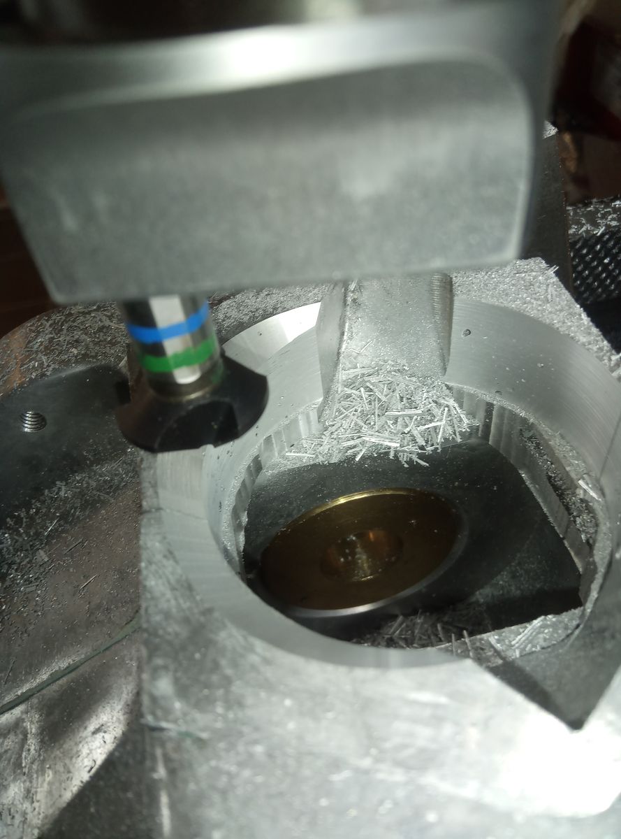 • Dadurch das ich das Material am Zylinderfuss aufschweißen lassen habe, musste die Bohrung im Zylinder neu ausgedreht werden, um die Abdichtung zwischen Buchse und Zylinder zu gewährleisten. Jetzt musste natürlich auch die Bohrung im Motorgehäuse noch etwas größer ausgespindelt werden. Dazu musste das Gehäuse genau ausgerichtet werden was einige Zeit in Anspruch genommen hat. Zusätzlich habe ich natürlich noch die 5x45 Grad Fase mit hergestellt.