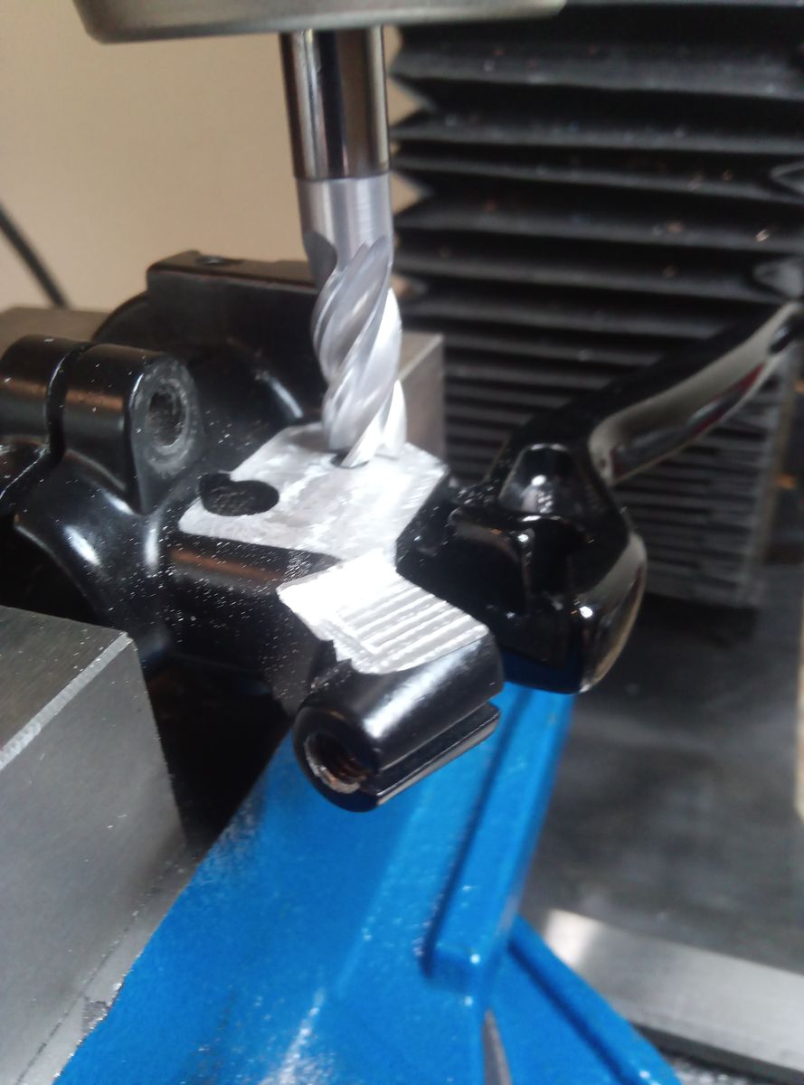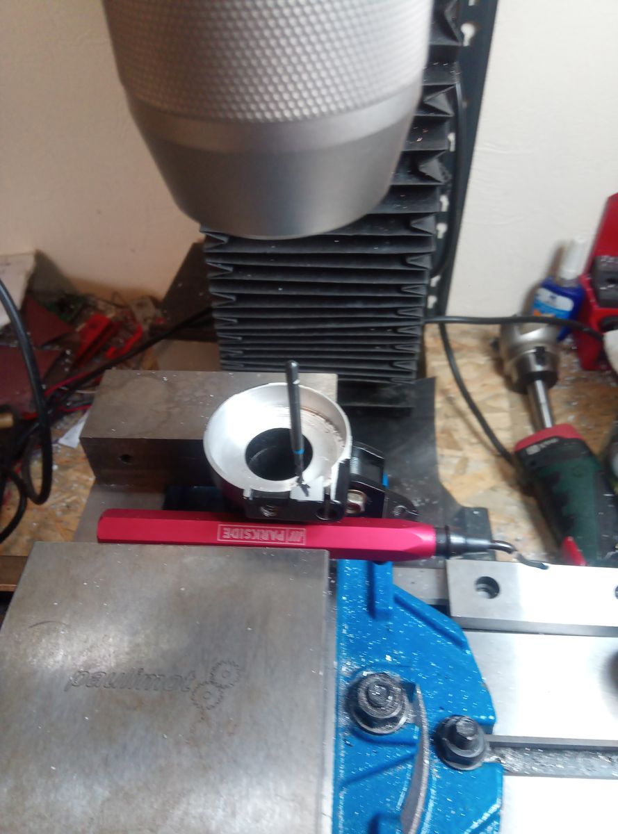 • Mein No-Fame Schnell-Gasgriff im Originalen Gehäuse war noch nicht ganz fertig. Es hat noch ein Endanschlag für die Nullstellung gefehlt. Dazu habe ich im Gehäuse ein M3 Bohrung gemacht und eine Madenschraube eingesetzt. Danach wurde es ein bisschen aufwendiger weil eine Kreisringnut im Wickelstück gefräst werden musste. Dazu musste das Wickelstück im "Teilapparat" gespannt werden. Die Stelle für den Anschlagspunkt hatte ich mir vorher markiert, weil mit den hin und her gedrehe vom Frästeil ist immer so eine Sache. Da hat man schnell die Nut in die falsche Richtung fabriziert. Hat aber alles geklappt. Durch den größeren Durchmesser der Rolle geht die Betätigung sogar leichter.