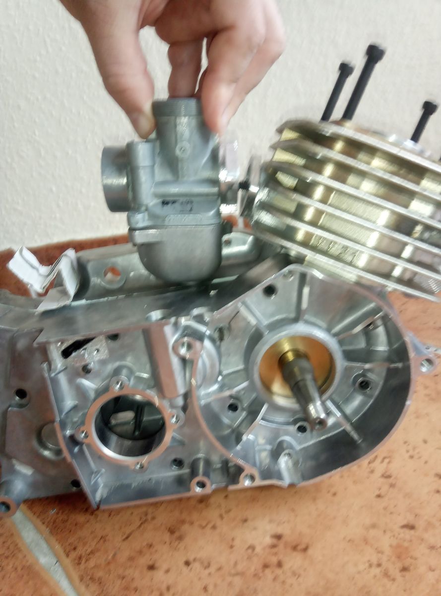 Kurzer Zwischenstand. Mein Leer-Motor ist wieder bei mein Alu-Schweißer. Der Ansaugstutzen wird noch einmal neu aufgeschweißt. Jetzt mit Stehbolzenbohrungen ist das besser zu sehen wie der Vergaser hinterher steht. Er soll ungefähr 10mm weiter nach hinten, etwas nach rechts in Fahrtrichtung, und etwas aufrechter stehen.