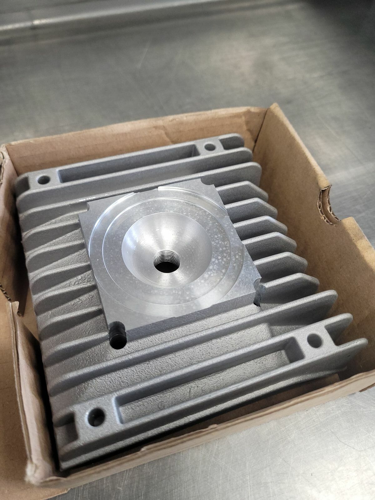 In gleichen Atemzug habe ich auch den LT-EVO Zylinderkopf mit zum Schweißen genommen. Ich hatte mir noch einen ohne Stehbolzenbohrungen bestellt. Der Kopf soll die gleiche Grundfläche wie die Zylinderoberseite ( Bild) bekommen, um den Wärmeübergang zu verbessern.