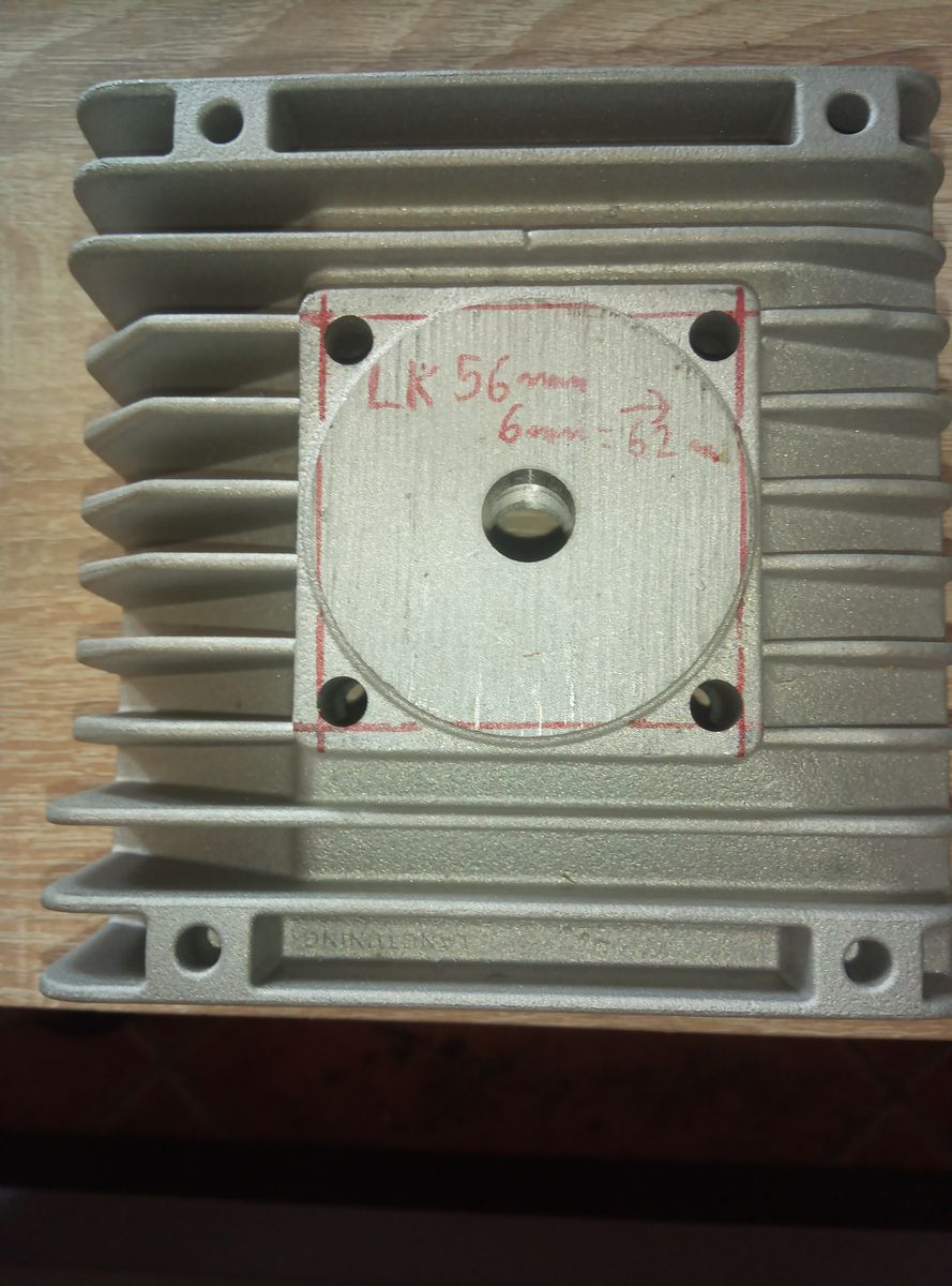 Hier das Bild vo mein ersten LT Evo-Kopf mit original 50x50mm Stehbolzenbohrungen. Mein 56mm Bohrbild habe ich angezeichnet. Die 2 hinteren Stehbolzenbohrungen sind nur noch 6mm nach hinten versetzt.