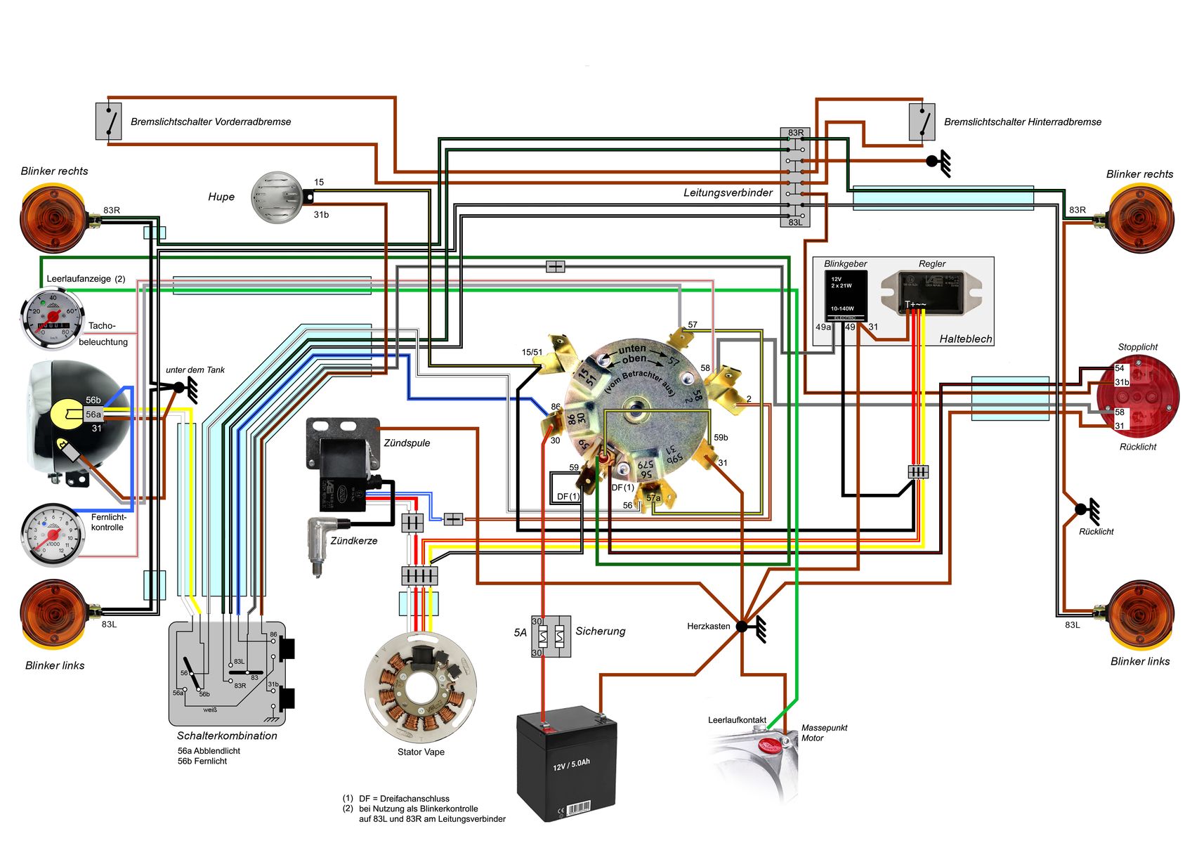 Blinkerkontrolle greift ihr einfach am Leitungsverbinder (Klemmbaustein) zwischen 83L und 83R ab. Bedenkt bitte, bei der Verwendung von LED-Blinkern müsst ihr in die beiden grünen Zuleitungen eine Sperrdiode (beide sperrend zur Kontrolleuchte) einlöten.Überprüft bitte noch, ob Euer Stator neben den beiden schwarzen Leitungen zum Regler und den beiden Leitungen zur Zündung ein zusätzliches braunes Massekabel hat. Wenn ja, schraubt die Öse mit auf die Masse im Herzkasten. Das eingezeichnete braune Kabel von selbigen auf das Motorgehäuse ist dann nicht nötig. Fehlt diese Masseleitung im Kabelstrang vom Stator zum Herzkasten, müsst ihr diese Masseleitung wie im Schaltplan auf jeden Fall einbauen.