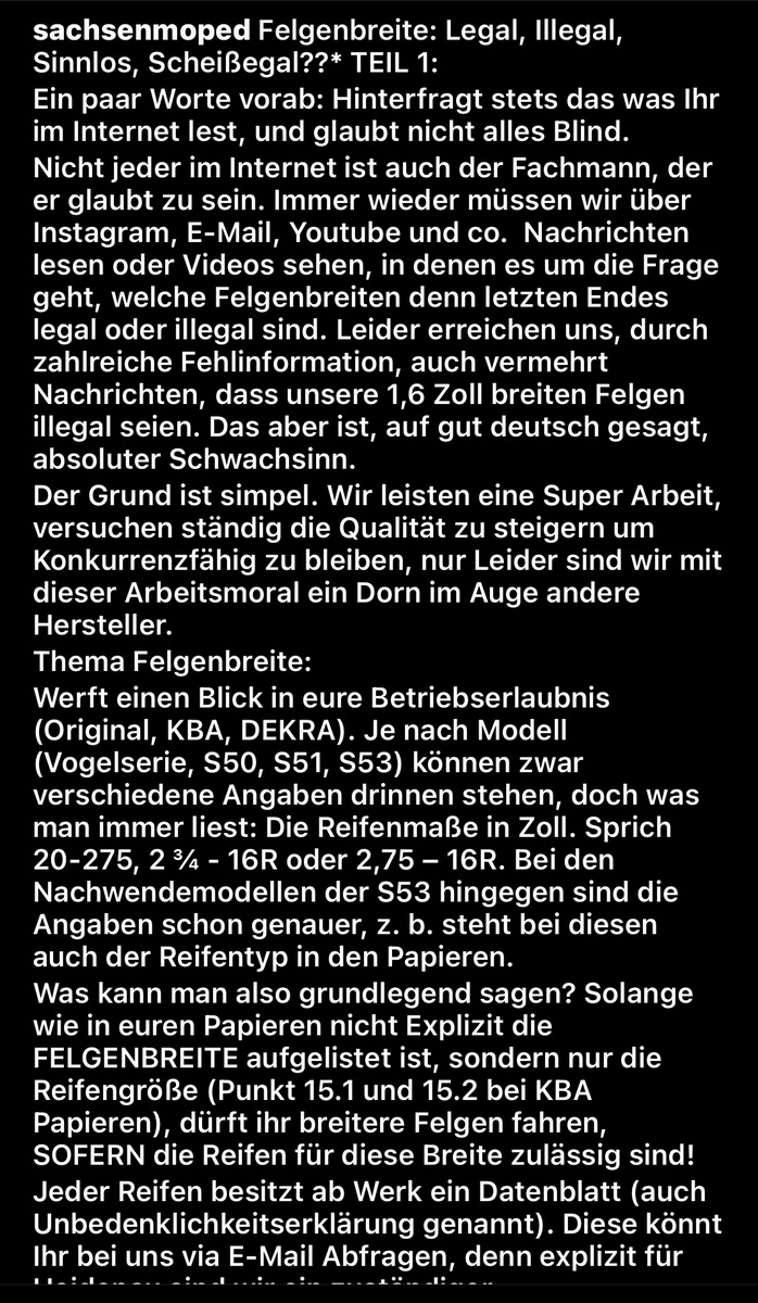 • Da wir zum aktuellen Zeitpunkt ja keine breiteren Felgen oder ähnliches eintragen können hat mich die Sache doch sehr Interessiert. Also Telefonhöhrer geschwungen und beim Technischen Dienst angerufen sowie die Herstellererklärung von SaMo hingeschickt. Heute die Rückmeldung, Sie haben Rücksprache mit Tamas gehalten welcher den Eigentlichen Prüfbericht partu nicht rausrücken will. Somit ist keine überprüfung möglich -> Keine Eintragung.