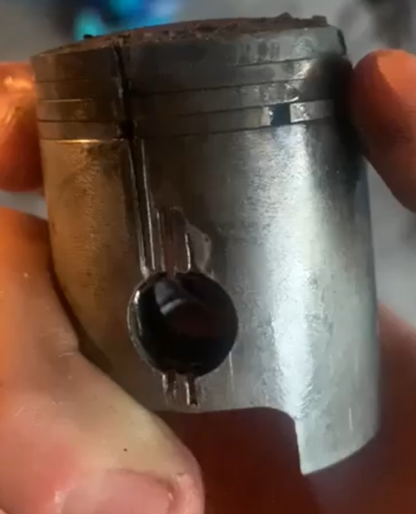 • Das Schadensbild kann mehrere Ursachen haben. Auf jeden Fall wurde hier nicht das empfohlene Mischöl verwendet. Der dadurch zunehmende Aufbrand auf dem Kolbenhemd behindert die Öltragfähigkeit und lässt die Schmierreserven sinken, zusätzlich wird durch Isolation die Wärmeabgabe des Kolbens behindert. Bei einer thermischen Überlastung des Kolbens kommt es dann zur Festkörperreibung und damit zum worst-case-szenario. Der Zylinder ist im unteren Bereich am kühlsten und dadurch enger als im Kopfbereich, dort scheint es dann auch die größte Reibung gegeben zu haben.