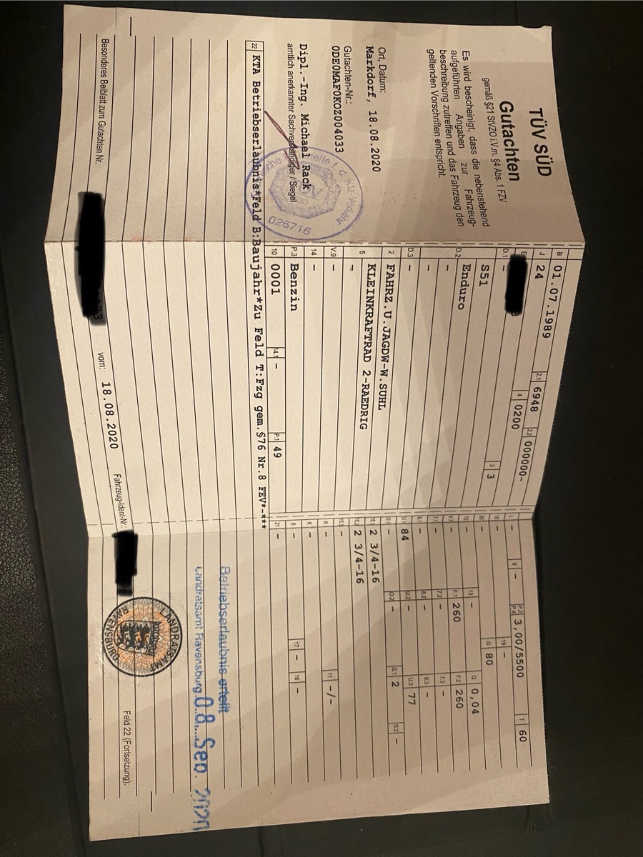Das hat mich insofern stutzig gemacht, als dass ich ein TÜV Gutachten habe, in welchem 60kmh als Geschwindigkeit eingetragen sind und welches auch von der Zulassungsstelle mit einem Betriebserlaubnisstempel versehen ist.