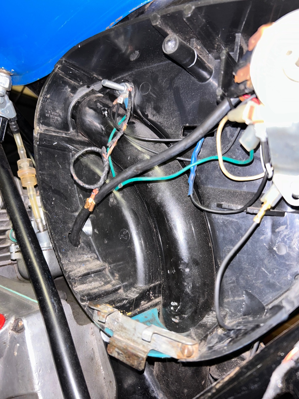 Da fehlt so einiges an der Elektrik. Ich gehe davon aus das keine Blinker verbaut sind. War da eine 6 Volt Batterie verbaut?