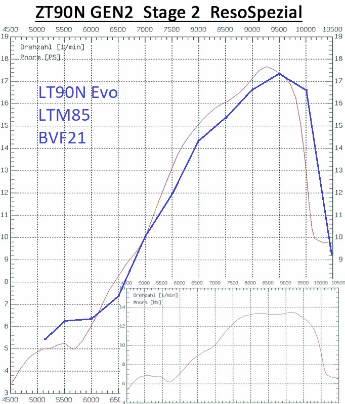 Habe mal aus Interesse das LT90N Evo Diagramm beim ZT90N zum Vergleich reingekritzelt. (Beide mit BVF21 und Auspuff vergleichbar)