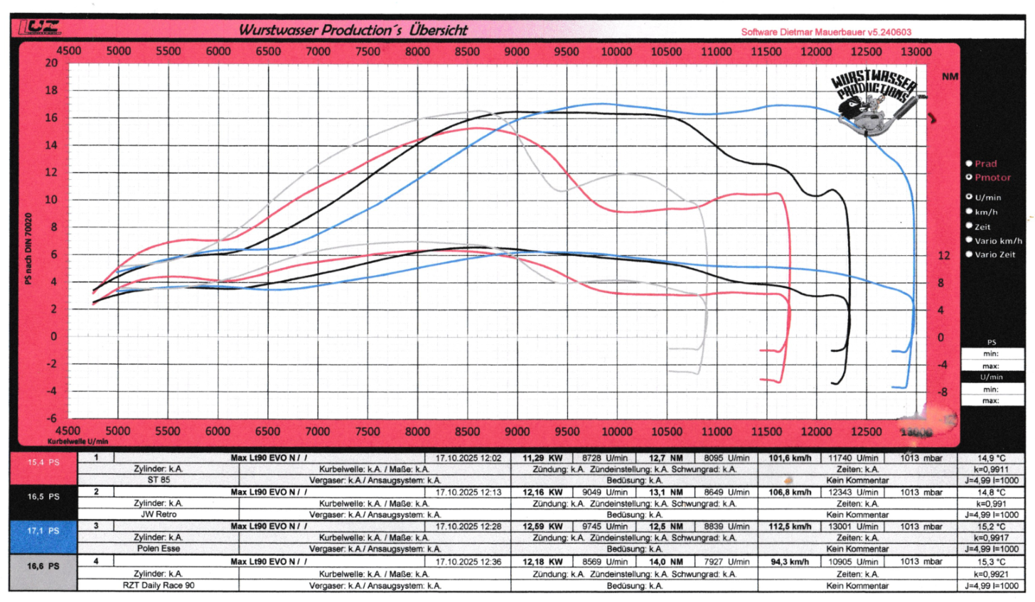 Ich fahr den Retro am JW Stock 85. Der geht schon gut ab, mit gewissen Kompromissen im unteren Drehzahlbereich. Fahrbar, aber Leistung ist erst bei 7000+ zu erwarten. Der Zylinder dreht bei 11.500 aus. Gemessen am Rad hatte ich 15 Ps was knappen 17 Ps an der Welle entsprechen sollte. JW zeigt im Diagramm ca. 15,2 Ps am Rad, bin von der HD einen Hauch fetter, als ich müsste. Vom Kanallayout sind sich JW Stock 85 und LT 90 Evo recht ähnlich. Zu den Unterschieden in den Steuerzeiten können bestimmt andere was sagen, da hab ich kein Vergleich. Ich hätte vermutet, dass sich die Zylinder sehr ähnlich fahren. Bin das Kit mit G85 Premium ebenfalls gefahren, fährt nicht 100% ideal, da ist Jeffrey aber auch mal drauf eingegangen, dass der Premium und Nebenauslässe nicht optimal harmonieren und hier der Stock85 Auspuff mit geschlossenem Kegel besser harmoniert.