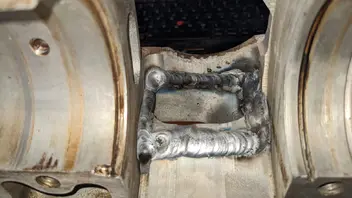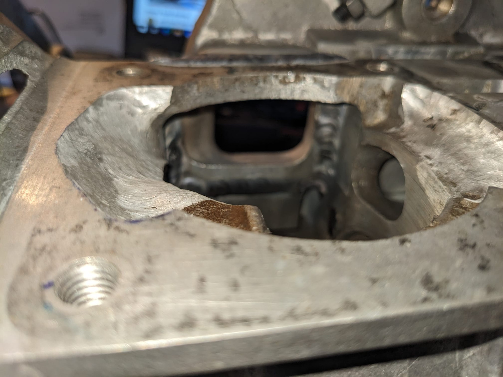 Wenn die schweißerei dann erledigt ist, werde ich die schon gegossenen Füllstücke einkleben, die originalen Stehbolzengewinde mit Alu Schrauben und jbweld verschließen und danach die fußdichtfläche neu planen und die neuen Gewinde für sie Zuganker setzen (geplant sind 85x85) damit ich an den nebenauslässen noch ein bisschen Luft zum schachten habe. Prinzipiell hat der Testguss gezeigt, dass Serienabstand möglich ist (nur mit zugankern, sonst würde man am fuß in die überströmer durchbrechen, wenn man platz für Muttern schafft), aber ich gehe da lieber auf Nummer sicher.
