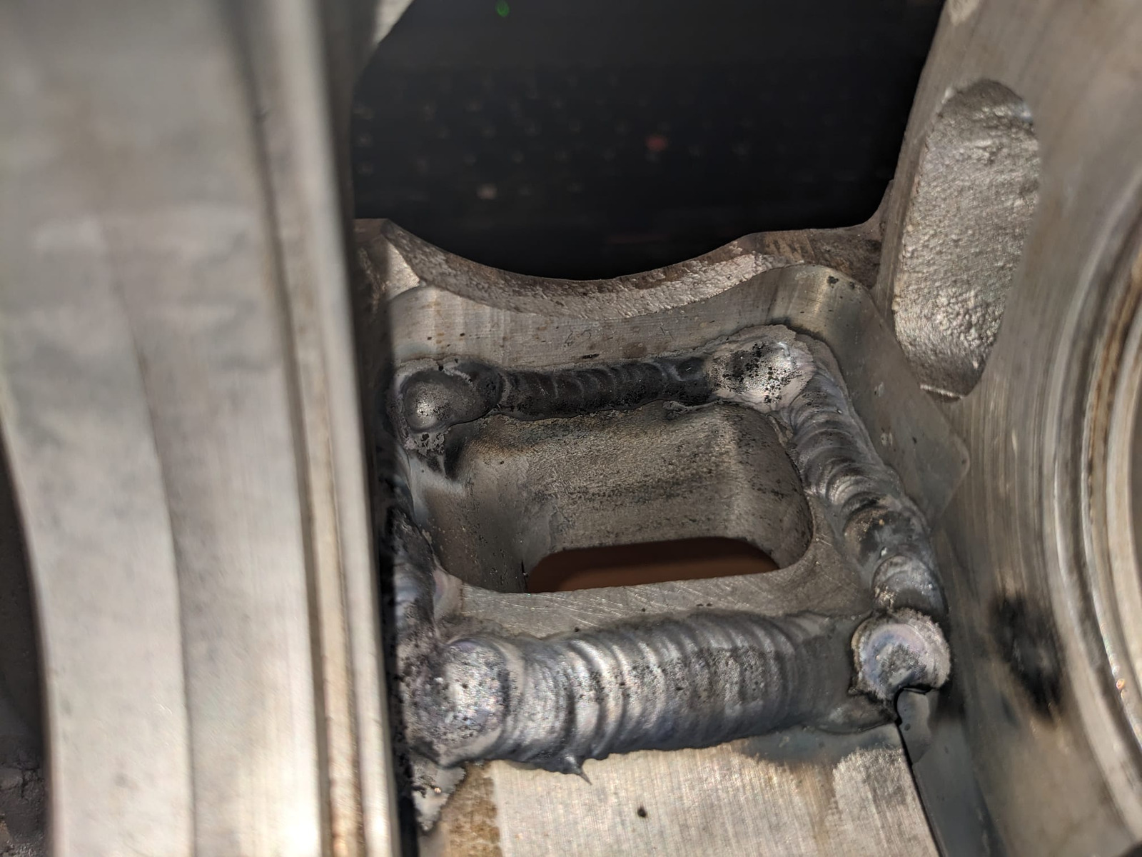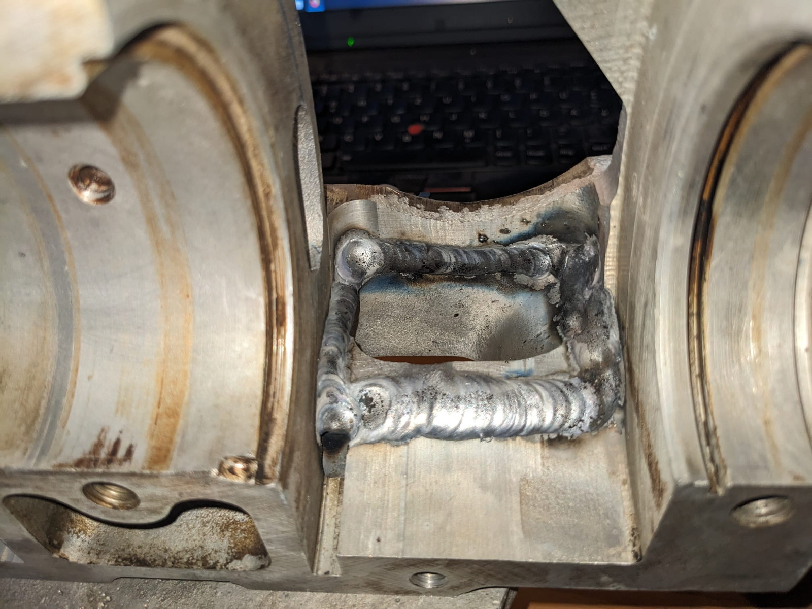Das Drehschiebergehäuse und das vorbereitete Gehäuseoberteil durften kürzlich heiraten. Dabei hatte ich ein mulmiges Gefühl was den Verzug angeht, obwohl mein Schweißmensch wirklich bedacht geschweißt hat. Glücklicherweise ist beim messen herausgekommen, dass die Gasse im vertretbaren Bereich geblieben ist, ich vermute viel anders sah das in der Serie auch nicht aus (habe vor dem schweißen nicht vermessen).