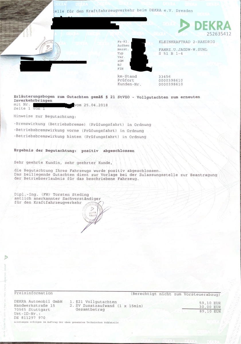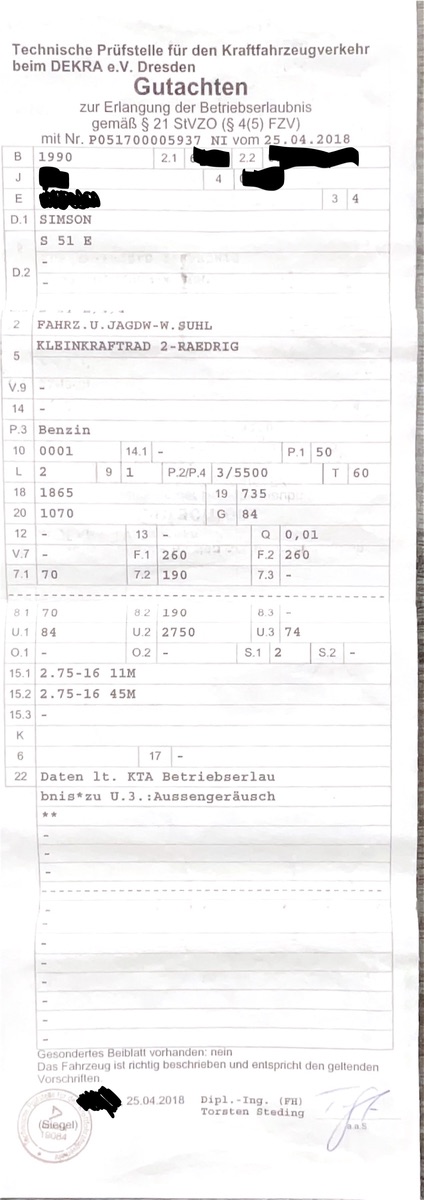 Moin, ich habe mir eine S51 gekauft. Der Vorbesitzer war damit beim Dekra und hat 3 blau/grüne Zettel bekommen (ich habe den ersten Zettel als Anhang eingefügt). Da steht das alles Vorschriftsgemäß ist. Und dann habe ich noch eine Bescheinigung über die Einzelgenehmigung gemäß § 4 Absatz 5 FZV(1. und 3. Bild). Da wurde auch alles ausgefüllt und so. Ist diese Bescheinigung jetzt das Fahrzeugpapier? Und ich kann doch damit auch 60 km/h fahren, oder?