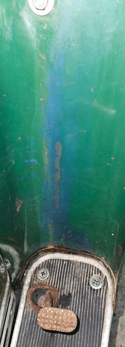 Unter dem Motortunnel siehts natürlich immer noch übel aus. Außerdem blitzt am Blechkleid an manchen Stellen blauer Lack durch. Weiß nicht ob das normal ist oder der grüne Lack vielleicht überlackiert wurde.
