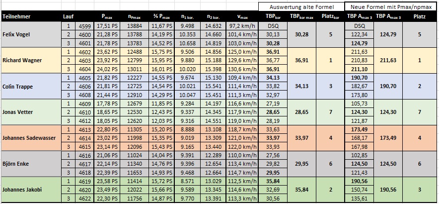 zu 2) Die Lage des Drehzahlbandes wird indirekt durch den Faktor Pmax/nPmax berücksichtigt. - Je höher die Drehzahl bei gleicher Leistung, umso kleiner wird der Faktor und dementsprechend die Gesamtpunktzahl. Eine gute Punktzahl bekommt man also, wenn man ein gutes Band ( viel Fläche zwichen n1 und n2) hat und eine hohe Pmax bei möglichst niedriger Drehzahl.
