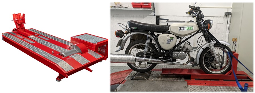 • Das Moped wird auf den Prüfstand gestellt und mit 2 Spanngurten befestigt
