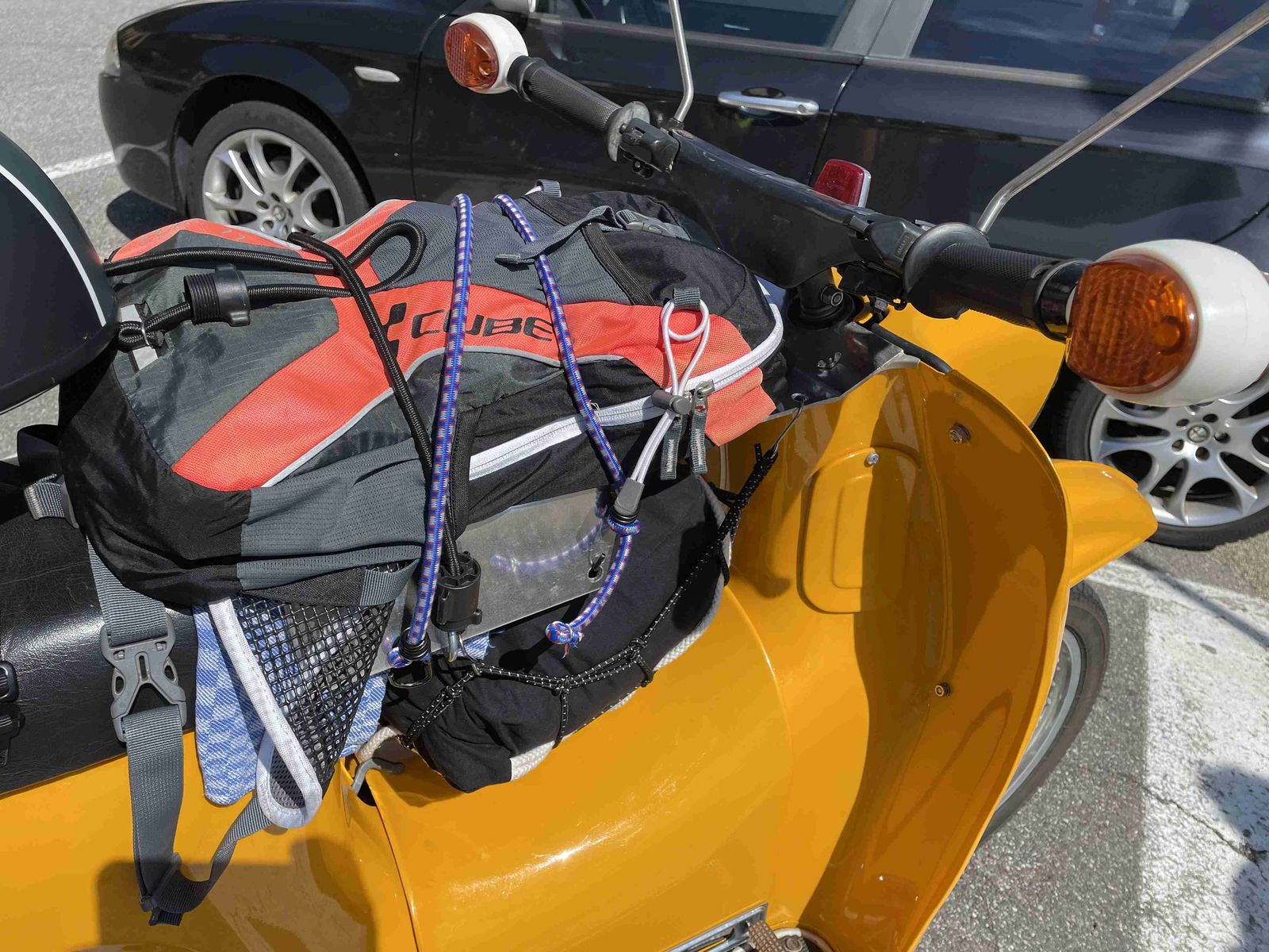 Das kniffligste sind die Gewindestifte vorne, die werden leicht gekontert in den Bohrungen des Verkleidungsblechs befestigt und bleiben dort stehen. Durch die Flügelmuttern kann man das zum Tanken schnell abnehmen, allerdings ist das die schwächste Stelle, da die M4 Schrauben für den Zweck etwas unterdimensioniert sind, also immer aufpassen und mit Gefühl bedienen. Die Flügelmuttern rütteln sich auch gern lose während der Fahrt, Ersatz ist da sinnvoll. Draufgespannt hatte ich einen Rucksack mit Trinkblase, kann man während dem Fahren mal einen Schluck nehmen. Im Gepäcknetz darunter war der Regenkombi. Hinten sollte man noch ein Tuch unterlegen, da das Alu sonst auf den Sitz abfärbt. Falls jemand Bock hat kann er die Idee ja als Gedankenanstoß verwenden.