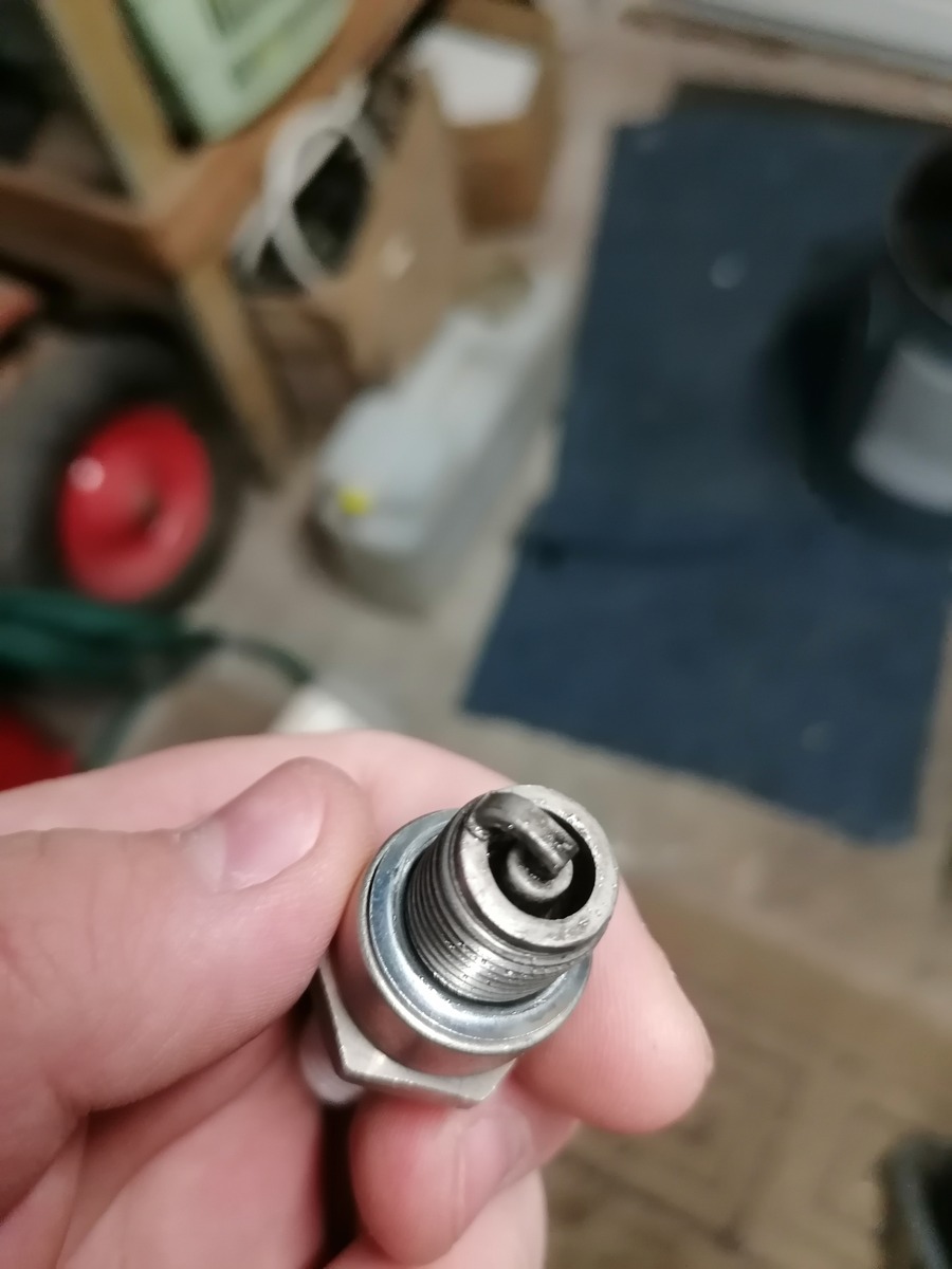 Habe ein Bild vom Funken gemacht und ein Bild nach dem ich sie 3 Mal angetreten habe. Eventuell schlecht zu erkennen aber die Zündkerze wird naß.