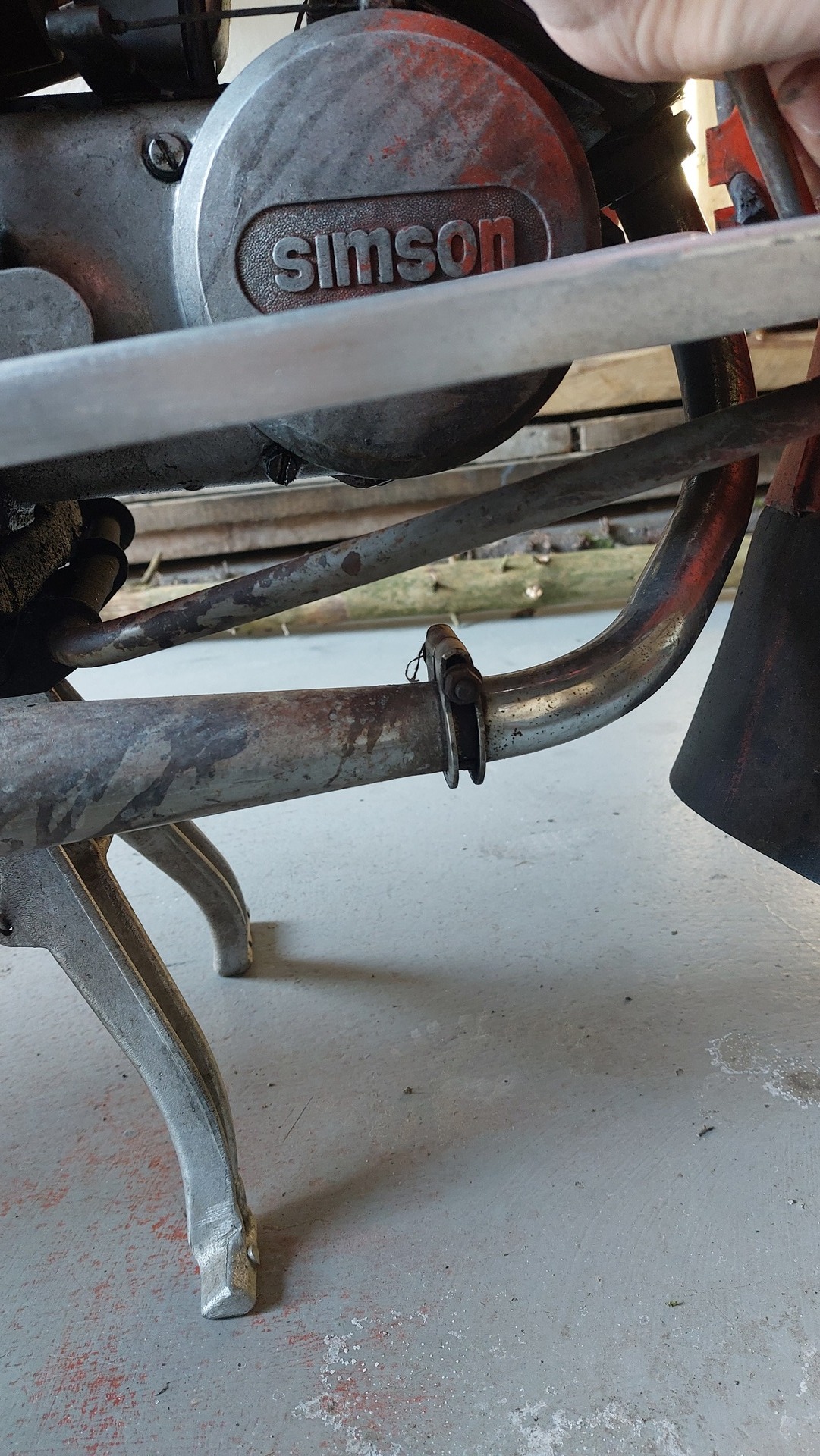 Das Trittstück vom Fußbremsbremshebel kommt auf den Auspuff. Sprich, er latscht damit auf den Auspuff wenn er Bremsen will,.