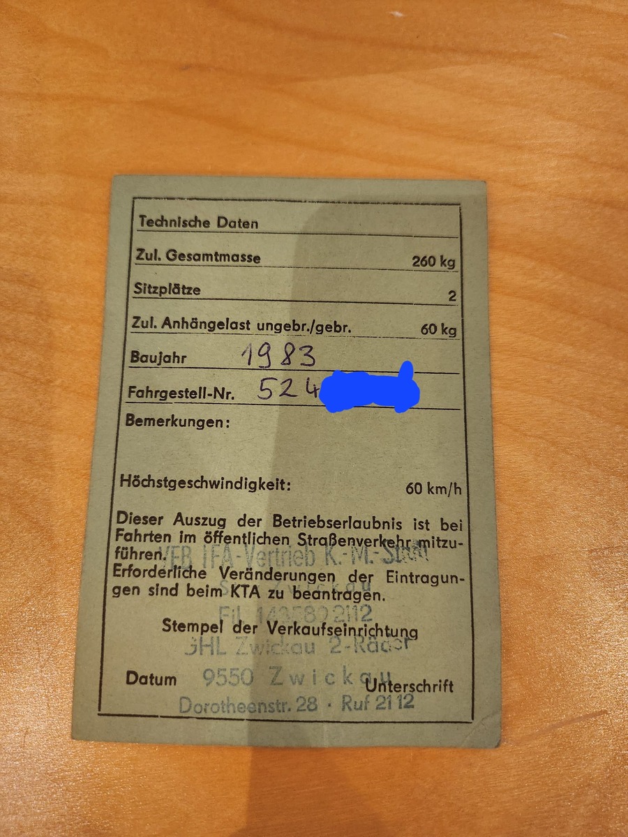 Falls die Rahmennummer nicht auf Export wie zB Ungarn hinweist, ist von DDR-Krad auszugehen.