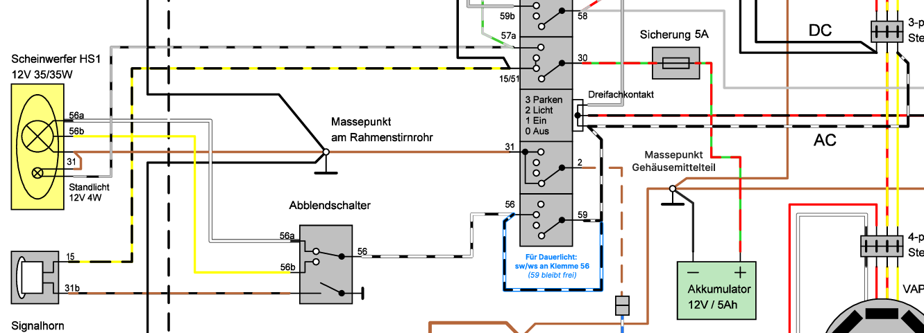 Und auf Dauerlicht umzuklemmen wegen eines defekten Kombischalter, nützt daher nichts.