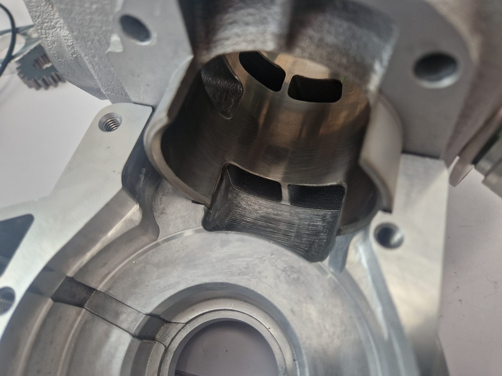 Hier übrigens Bilder vom fertig bearbeiteten Kurbelgehäuse. Das Gehäuse wurde im Durchmesser 2mm größer gespindelt, damit die größeren Hubwangen reinpassen. Die "Nut" fürs Pleuel wurde auch noch 1,8mm im Durchmesser größer und tiefer gespindelt. Es passt so alles ganz gut, auch wenn die Dichtfläche deutlich kleiner geworden ist. Erfahrungsgemäß weiß ich aber, dass das so definitiv funktioniert. Ich fahre es seit fast 5 Jahren so, ohne Probleme.