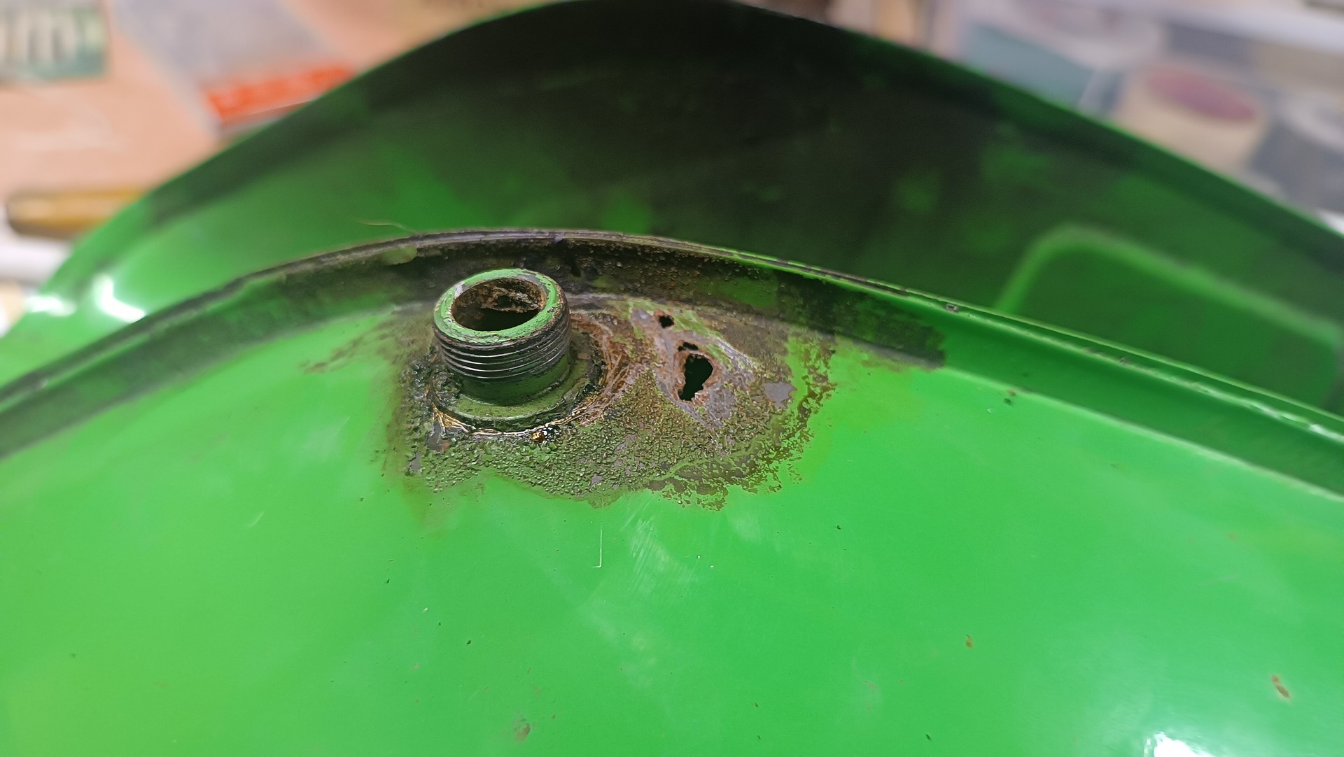 • Zum scheißen ist der Rost außen schnell entfernt. Die Blechstärke um das Loch herum ist dünn (auch wegen Rost). Daher ist das Schweißen nicht so einfach. Vorher entrosten ist gut. Beim Schweißen von Benzintanks ist Vorsicht geboten, die Benzindämpfe können sich entzünden. Manche füllen die Tanks daher beim Schweißen mit Wasser.