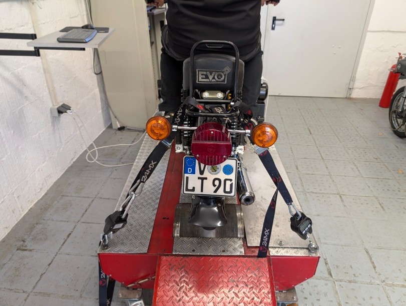 • Das Moped wird auf den Prüfstand gestellt und mit 2 Spanngurten vorn befestigt