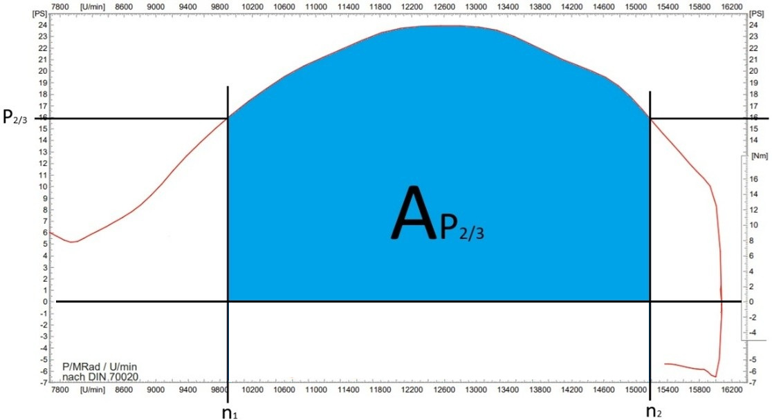 Bei der Berechnung der Tuba-Punkte wird die Leistung als Menge betrachtet (Flächeninhalt unter der Kurve AP2/3). Dadurch ist es möglich, das Leistungsvermögen des Motors im Bereich von P2/3 zu bewerten. Wenn die Leistungskurve innerhalb des Drehzahlbandes (bei P2/3) einen Einbruch oder einen sehr spitzen An- bzw. Abstieg hat, so wirkt sich dies entsprechend negativ auf die Bewertung aus.