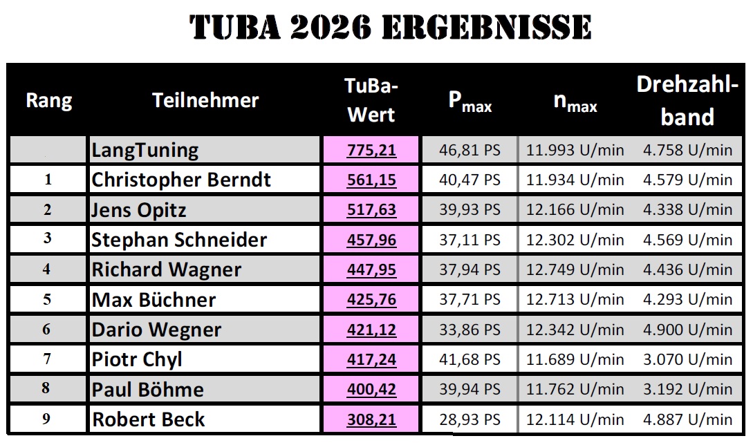Wir gratulieren allen genannten Teilnehmern für die erfolgreiche Teilnahme am Tuba. Was ihr geleistet habt war alles sehenswert. Im besonderen gratulieren wir dem Sieger Christopher Berndt (Waffenschmiede Ostschleifer) und Platz 2 (ZT-Tuning) und Platz 3 Stephan Schneider (Männerhort).