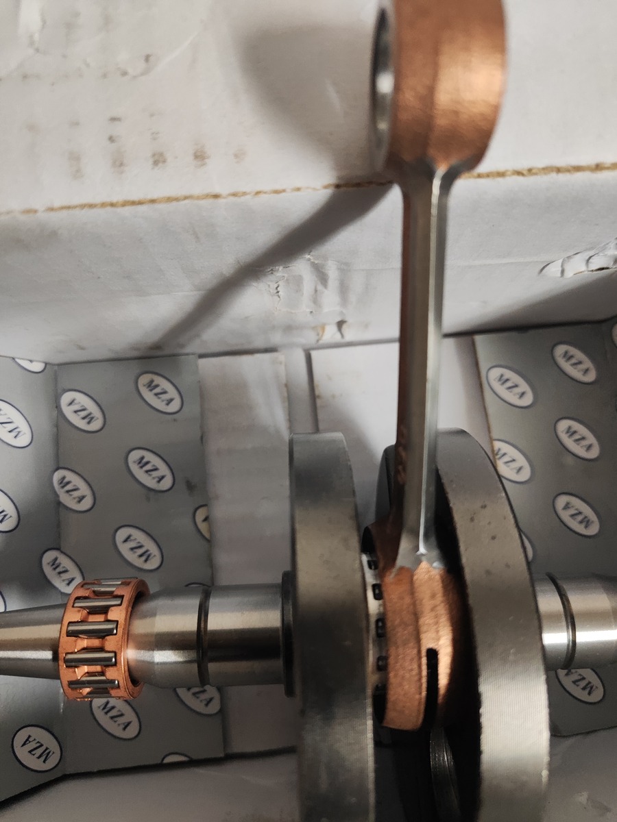 • Es gibt ja KW für 50-60ccm und für 70ccm. Da die Hubwangen massiv sind, ist die KW halt für 50 bis 70ccm. Es kommt ja auf das Kolbengewicht an. Hier mal eine KW mit verstärkten, breiteren, versilberten Barikit Pleuellager. Der Pleuel wurde erleichtert.