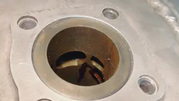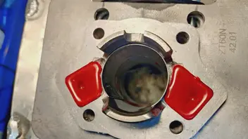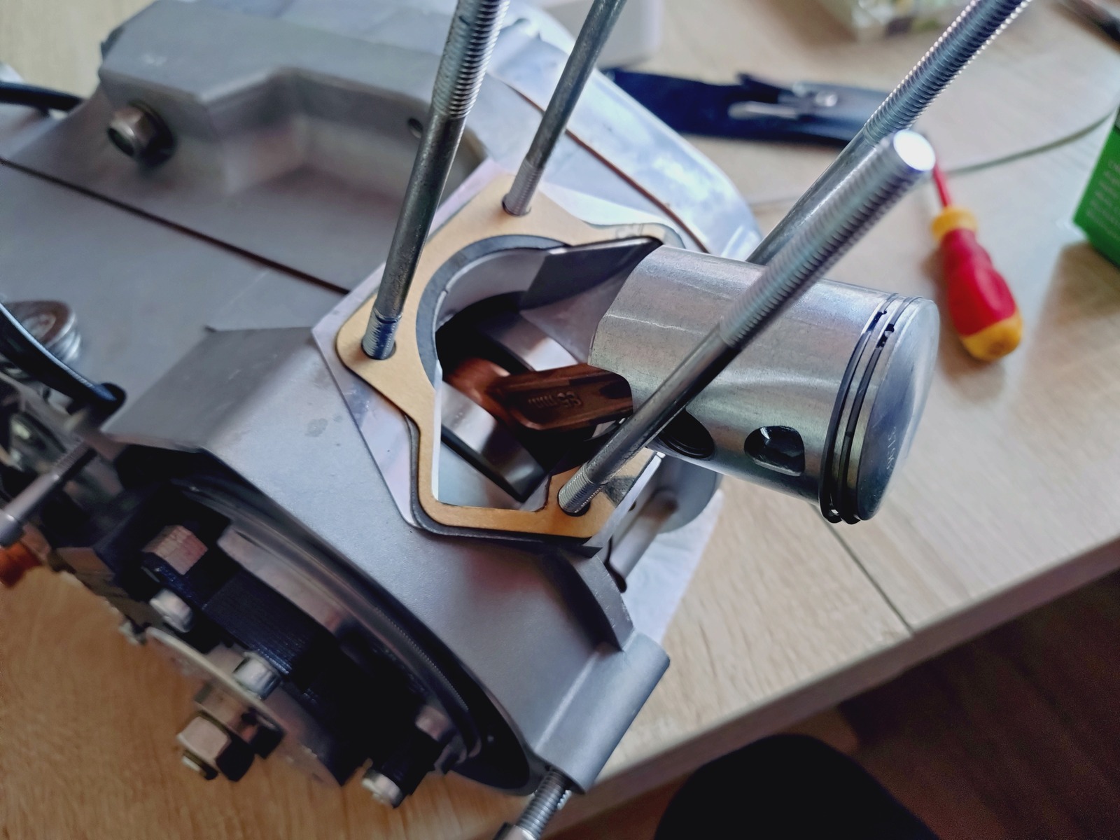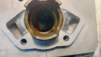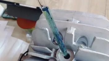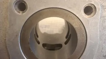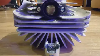 Mit 0,5mm Fußdichtung lande ich bei 0,6mm Quetschspalt. Mit 2T Öl ausgelitert passen 5mL in den Brennraum bis das Kerzengewinde erreicht ist (Kolben ist OT)