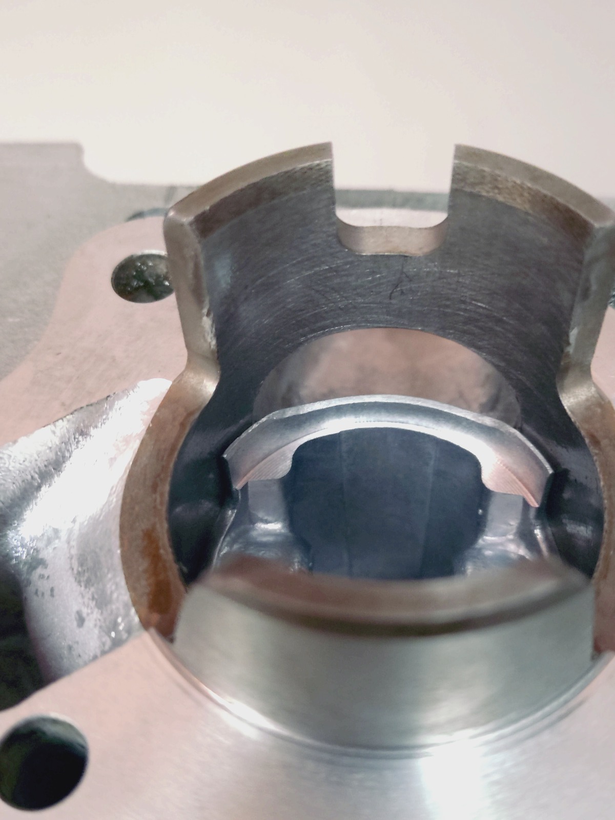 Wie gut der Kolben sich abstützen kann in der Buchse zeige ich sobald ich die Kanäle final gefräst habe. Die Höhen sind noch untermaßig und im Kanal werd ich noch glätten.
